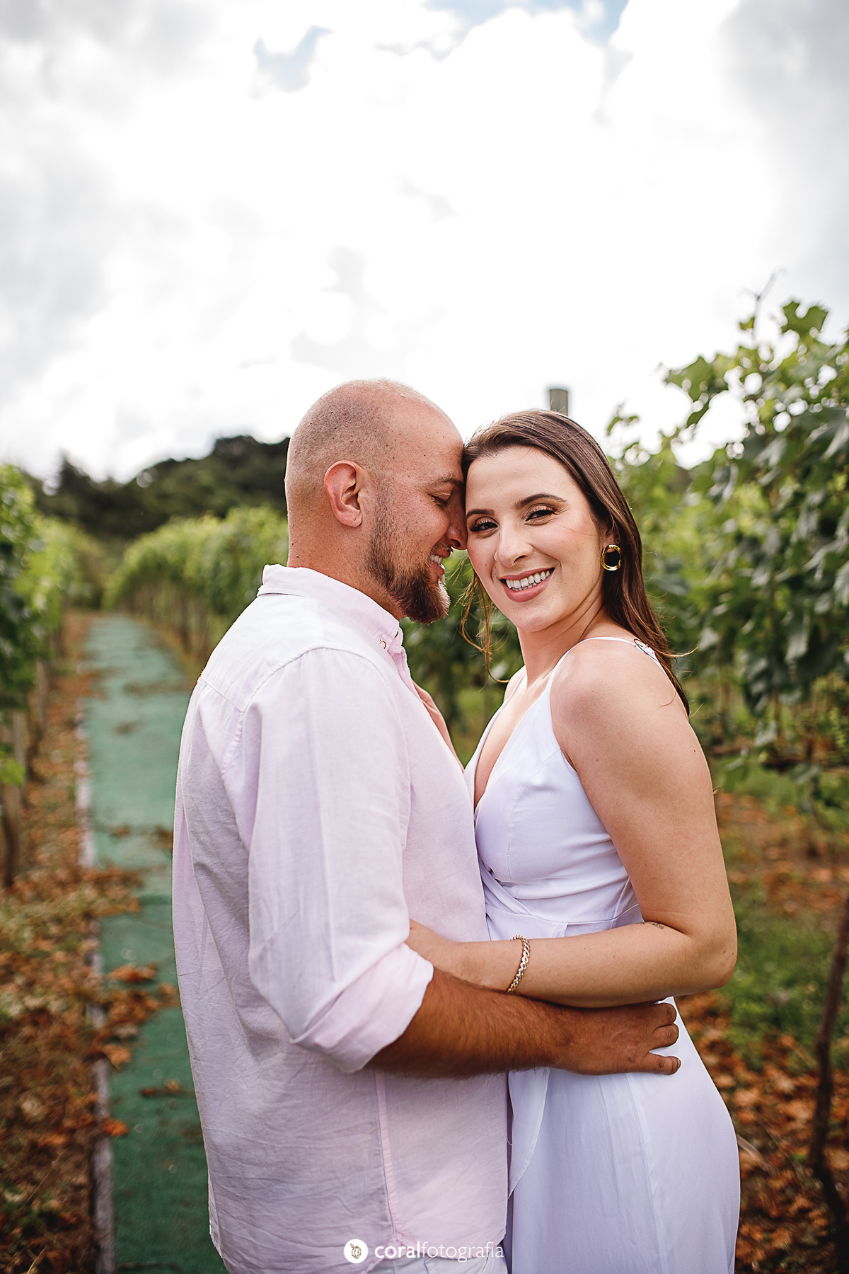 Ao chegar ao vinhedo, fomos recebidos por fileiras de parreiras carregadas, um céu que se alternava entre nuvens e luz suave, e uma atmosfera de tranquilidade. Entre taças erguidas, sorrisos sinceros e olhares cúmplices, capturamos momentos que falamos por si só: a delicadeza do toque, a alegria de dividir sonhos, e a harmonia de duas almas que se encontram.