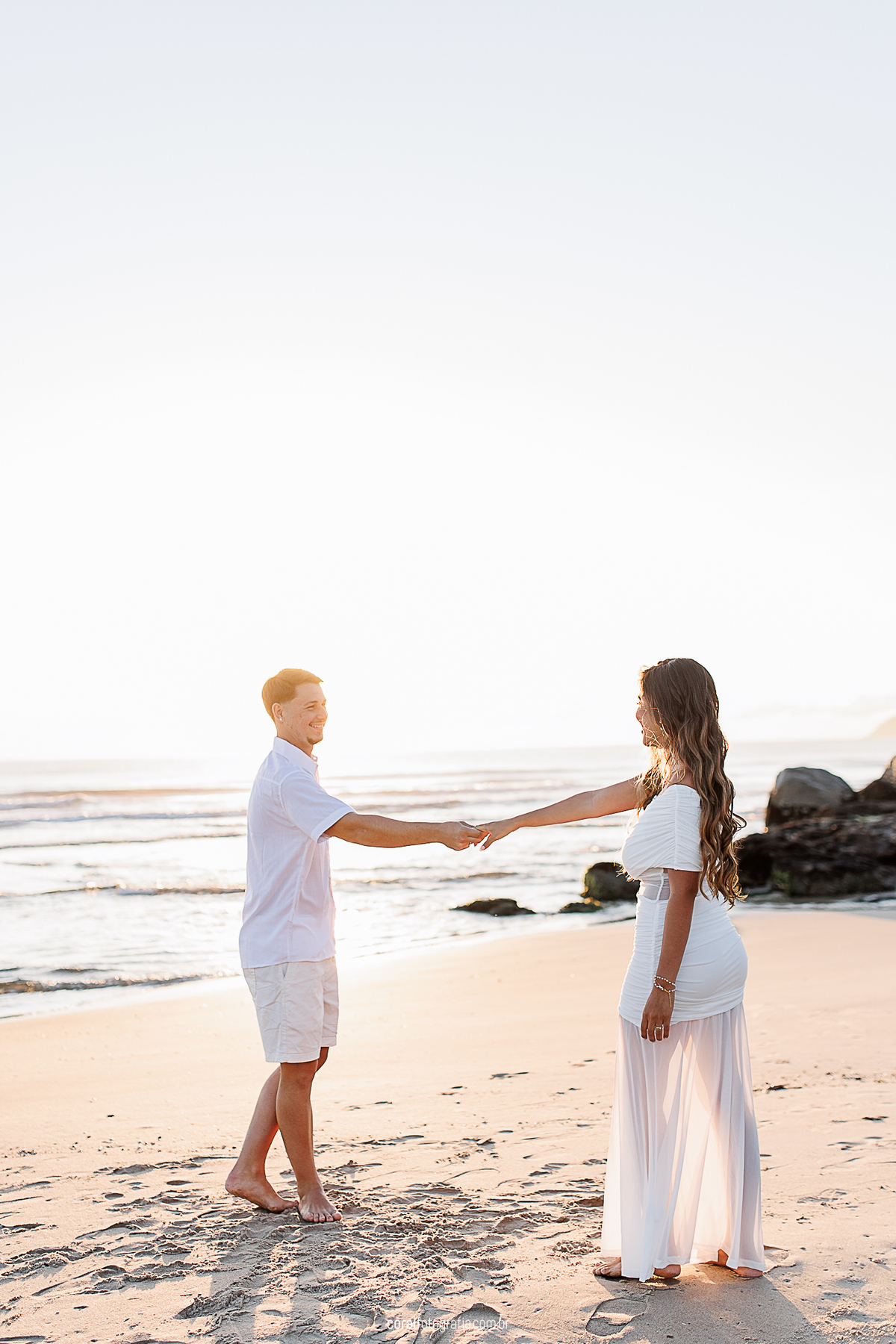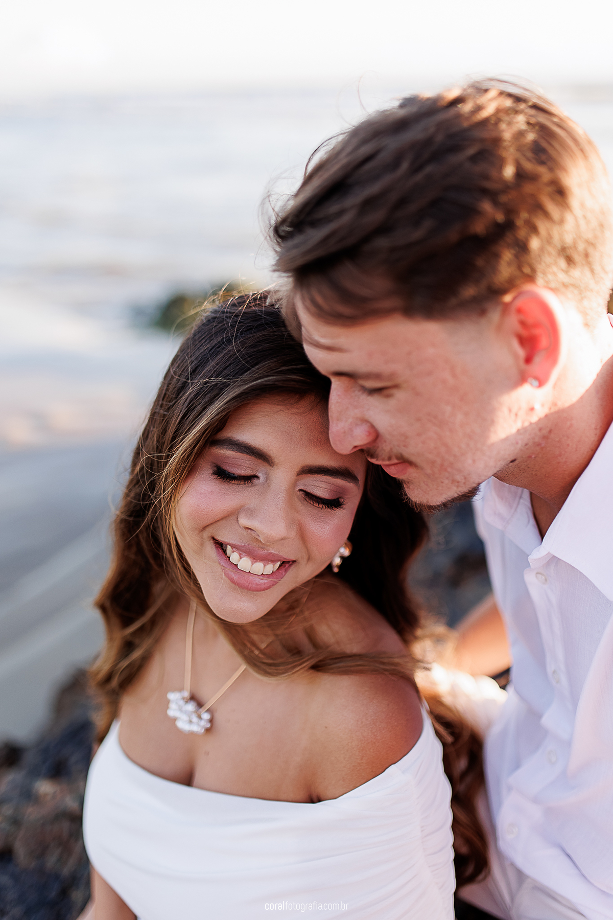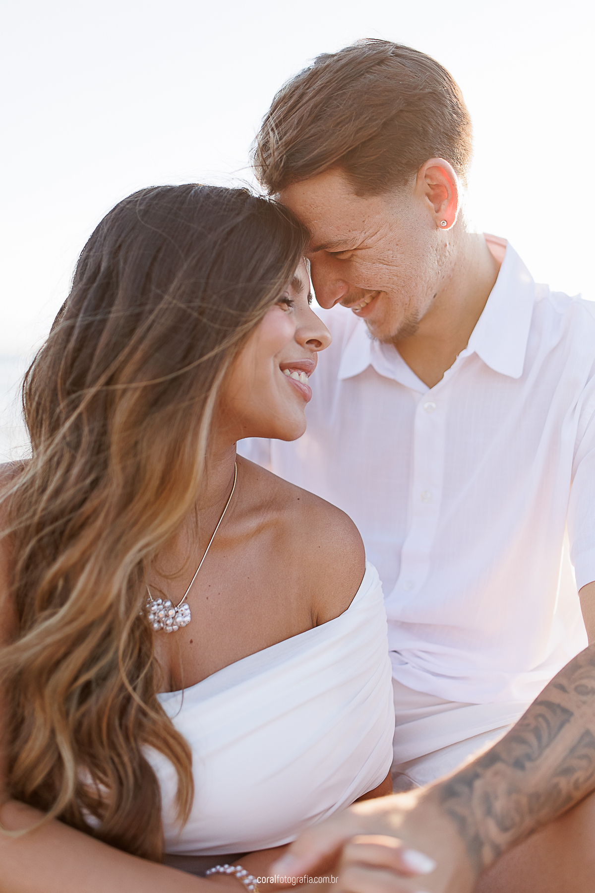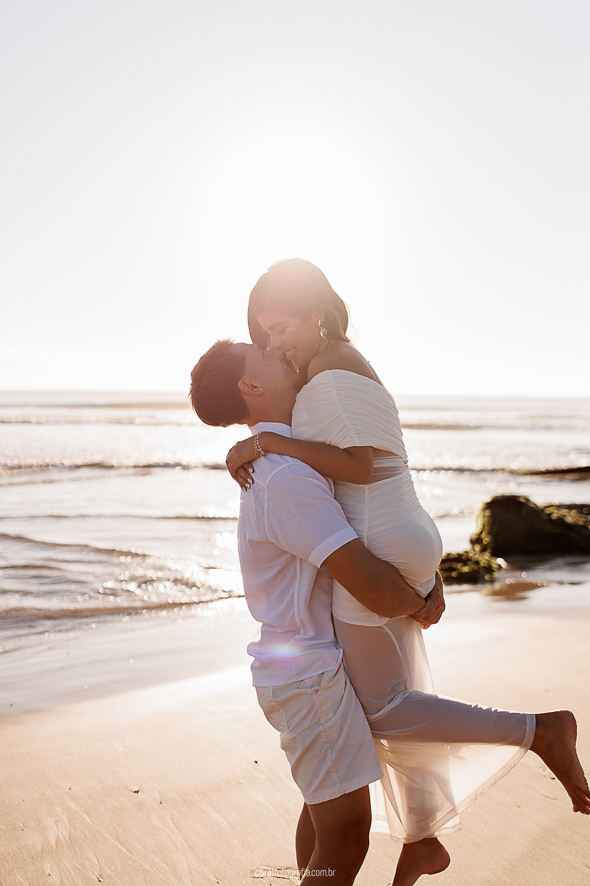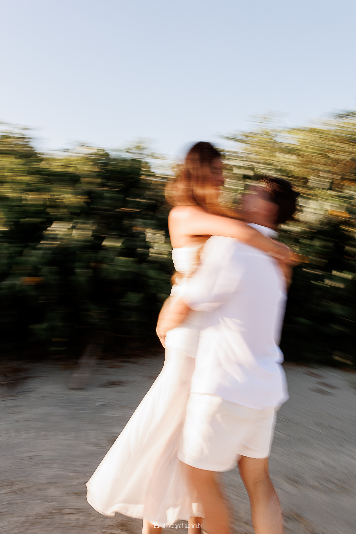 Entre risadas, passos descalços e conversas que fluíam naturalmente, deixamos o momento acontecer. A cada minuto o céu mudava, a luz ficava mais dourada, e a conexão deles ficava ainda mais evidente. Não foi só um ensaio. Foi uma manhã vivida com intensidade, fé e presença.
