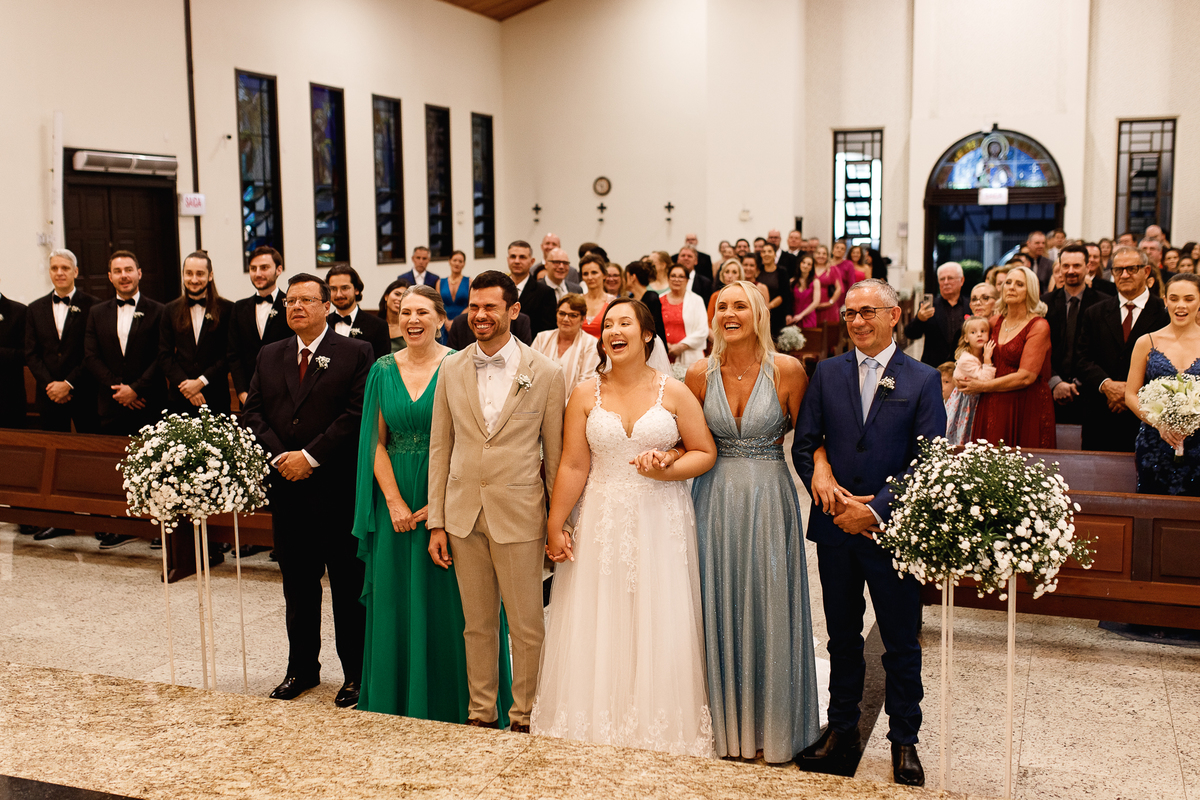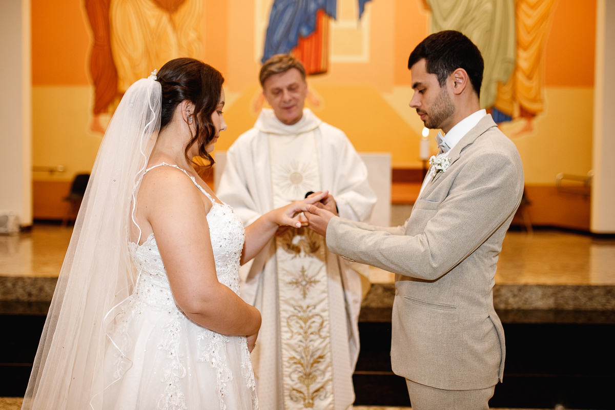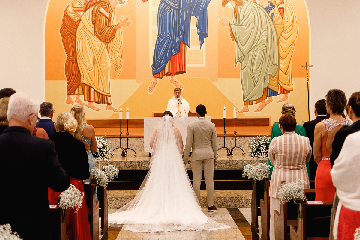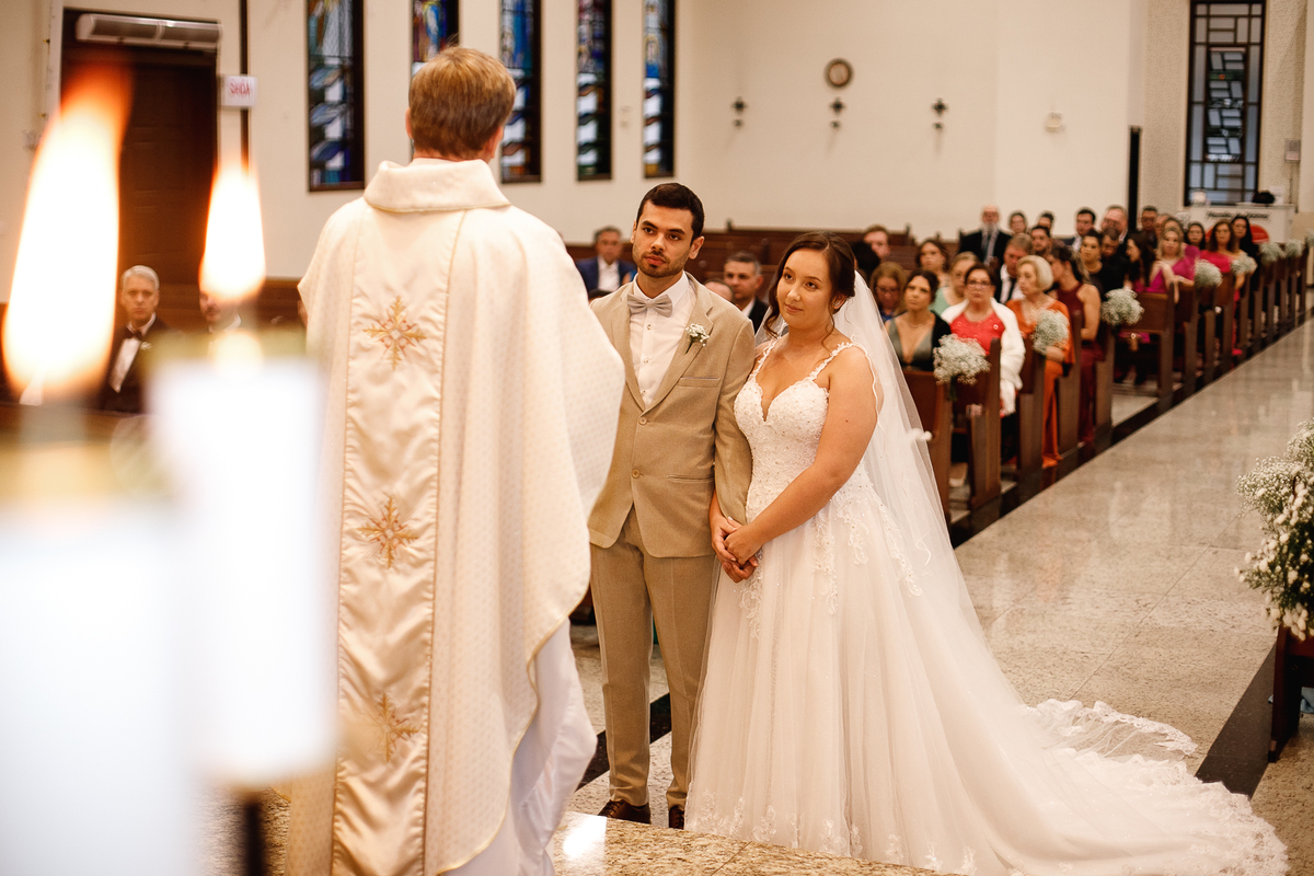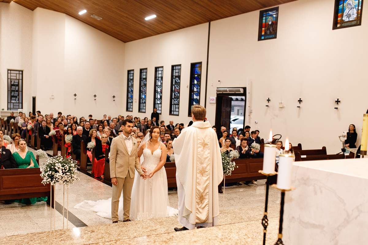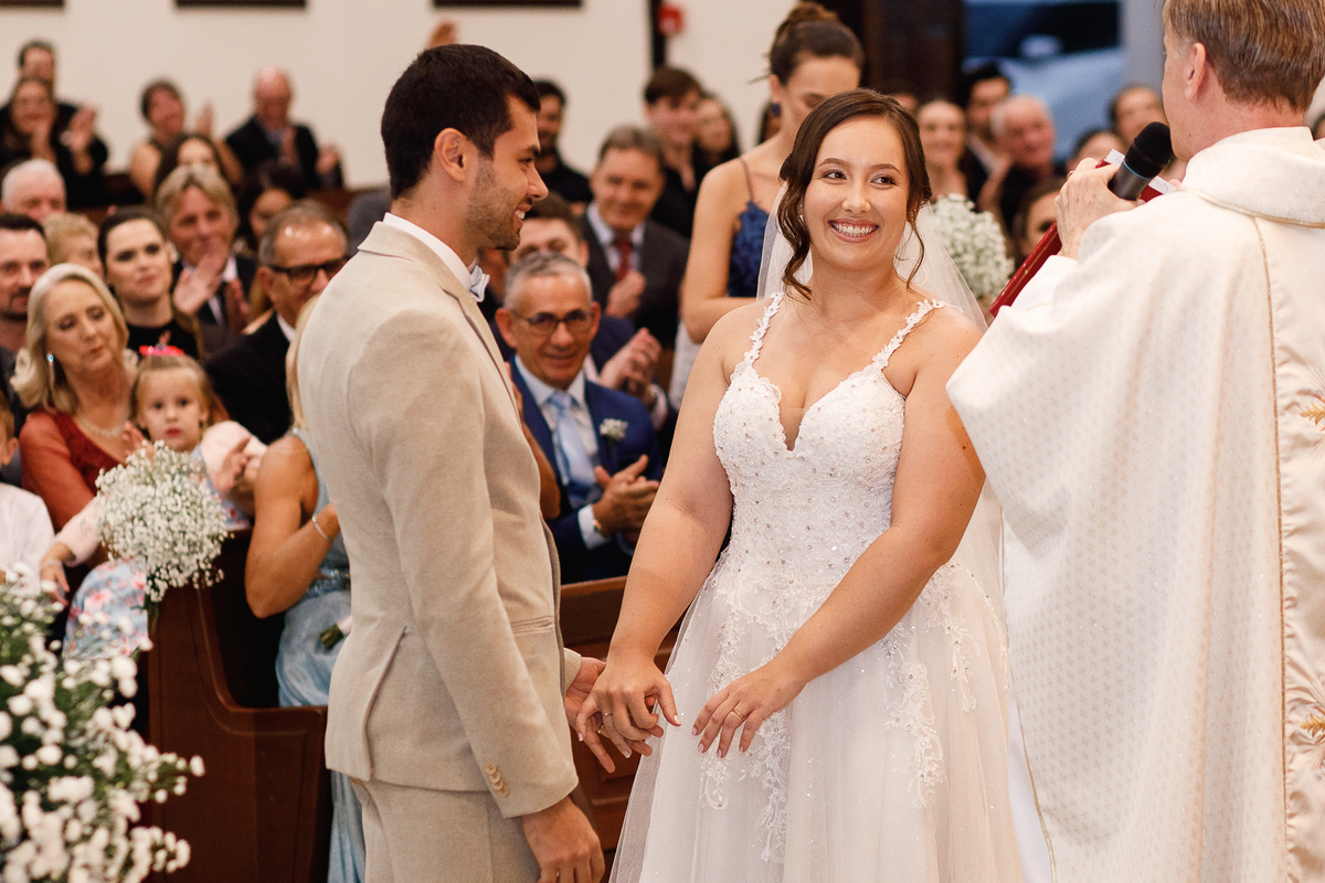 Renata e Eduardo disseram “sim” diante do altar, na presença de Deus, rodeados pelo carinho das pessoas que mais amam. A cerimônia na igreja foi íntima e cheia de significado—com olhares cúmplices, sorrisos sinceros e mãos entrelaçadas que não queriam mais se soltar.