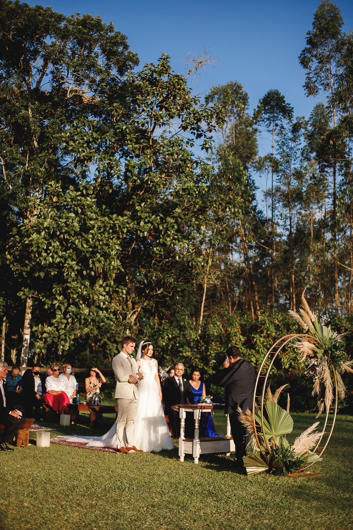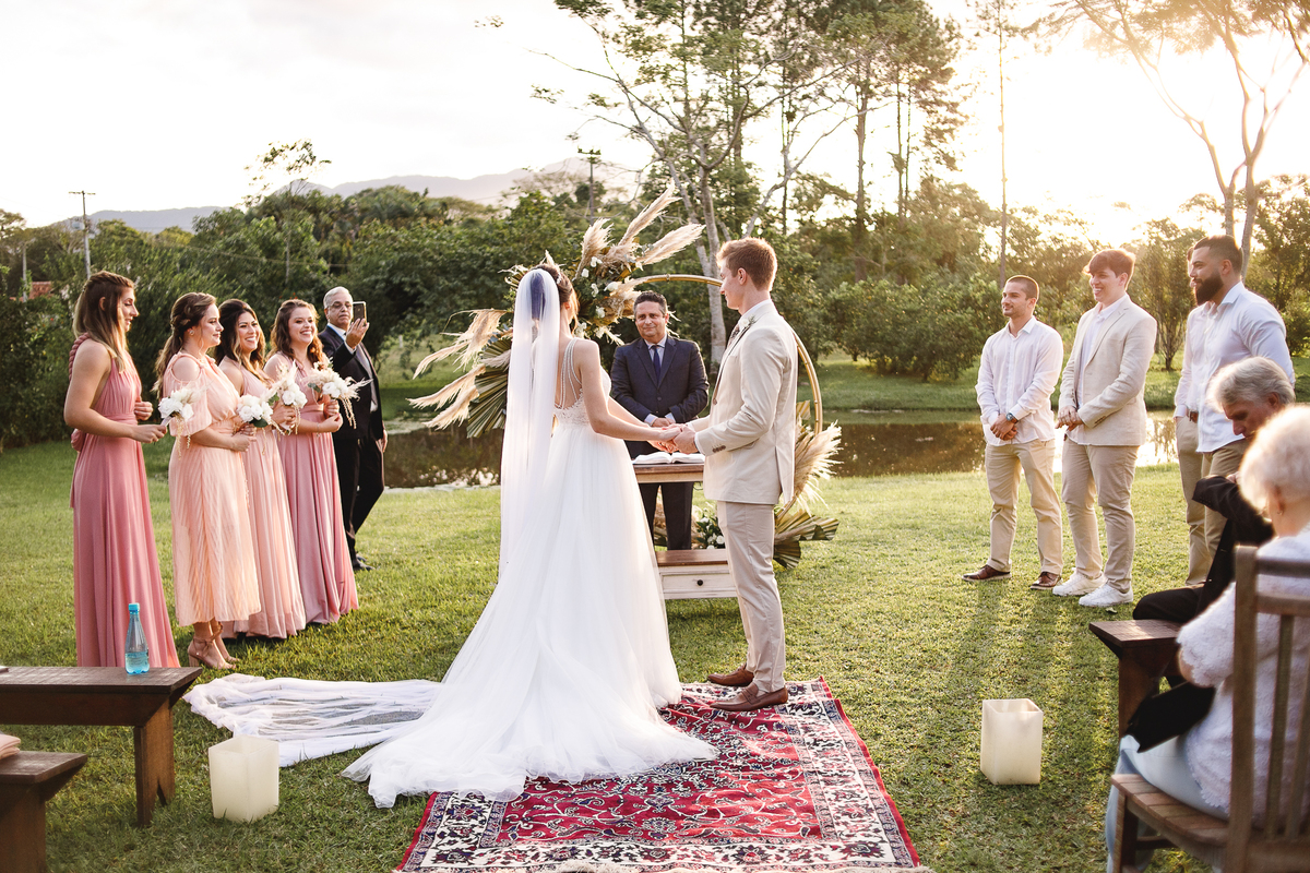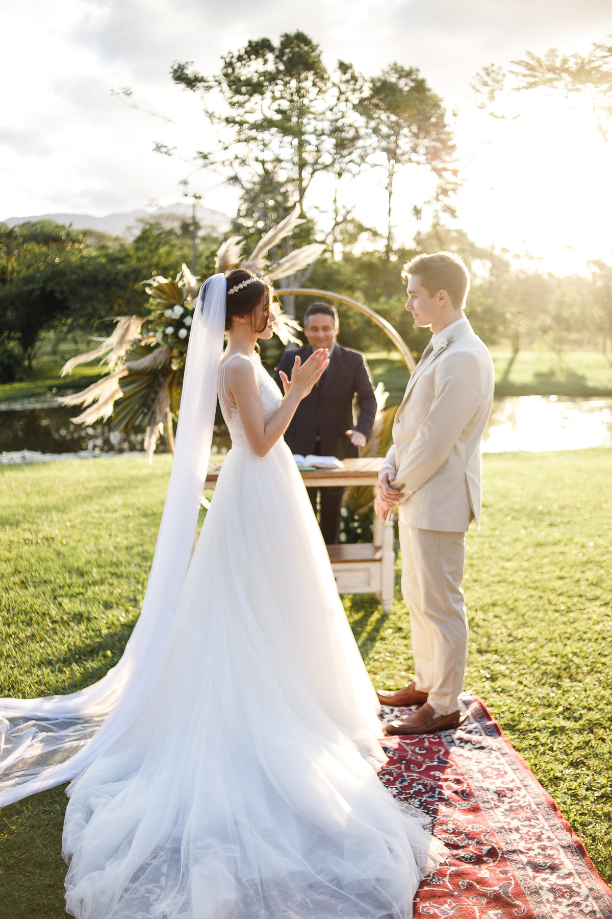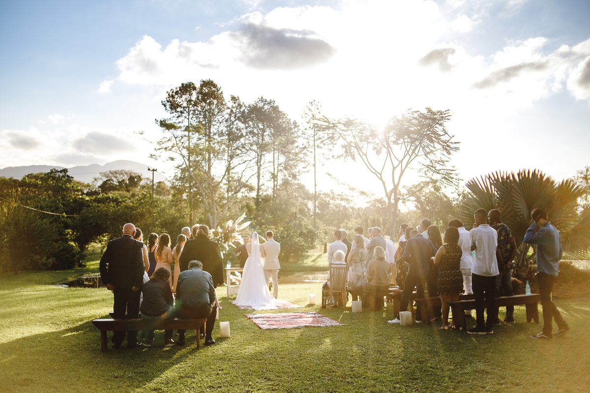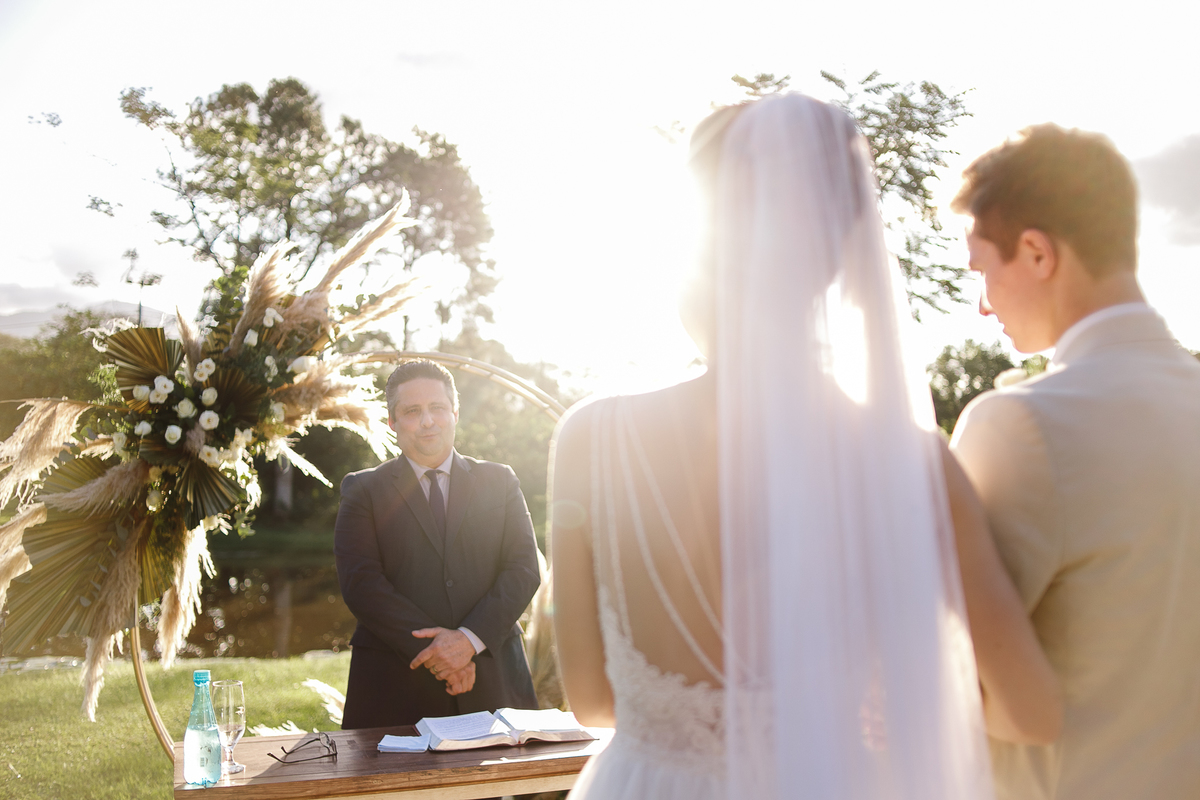 A semana inteira foi de céu fechado e nuvens carregadas. O clima parecia querer testar a calma de todo mundo. Mas no grande dia, algo mágico aconteceu: o céu ainda estava nublado quando a Ruama chegou, mas foi só ela colocar o pé pra fora do carro que o sol surgiu, com força e intenção. E QUE SOL! Um dourado quente e acolhedor tomou conta do horizonte e permaneceu ali, firme, iluminando toda a cerimônia. Era como se o universo tivesse esperado aquele exato momento para abrir o céu.