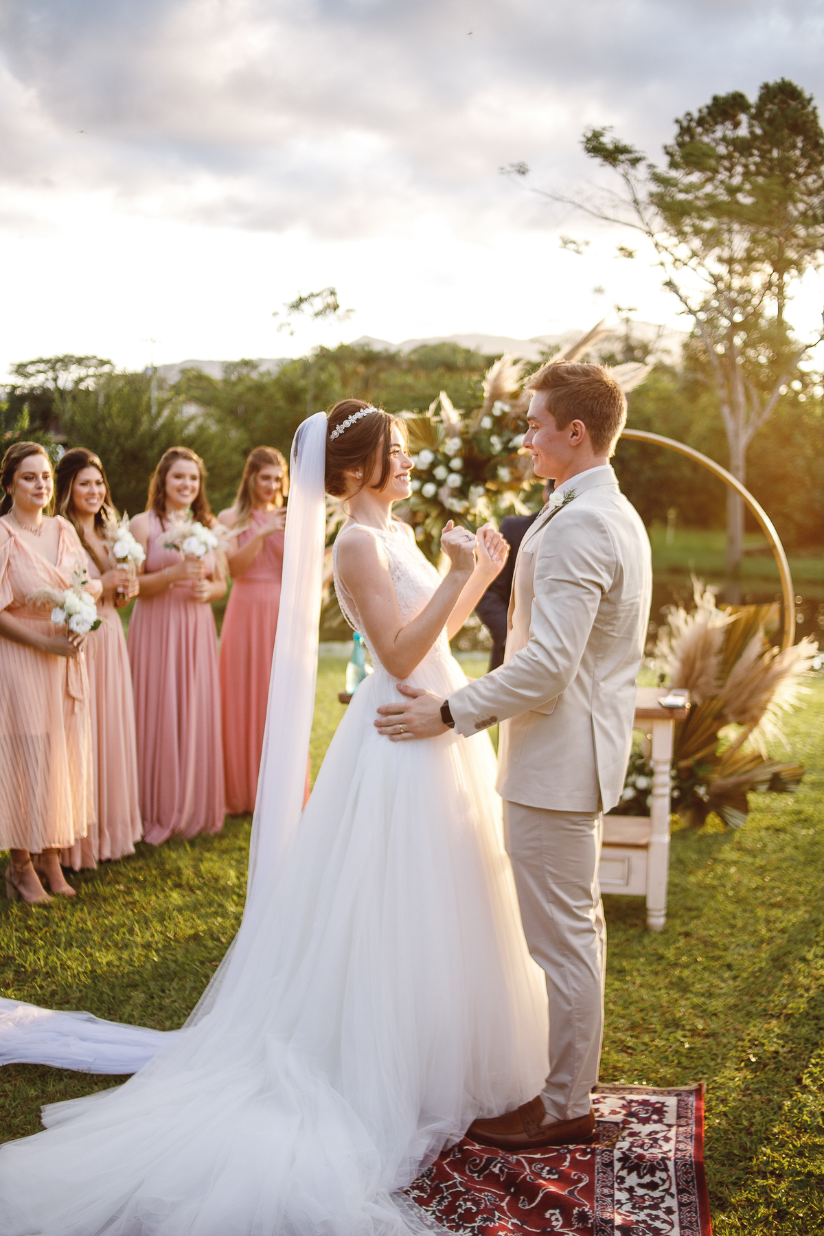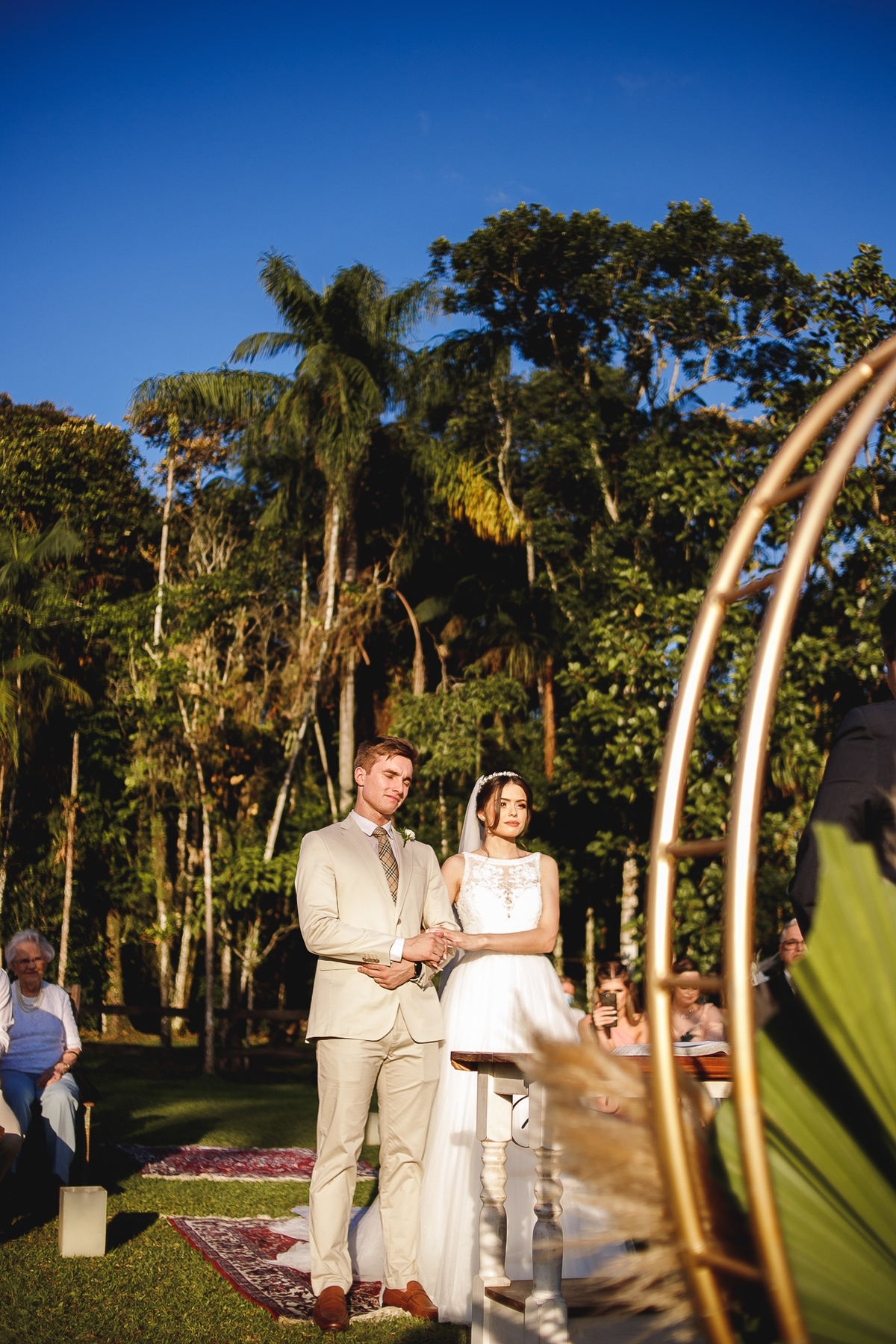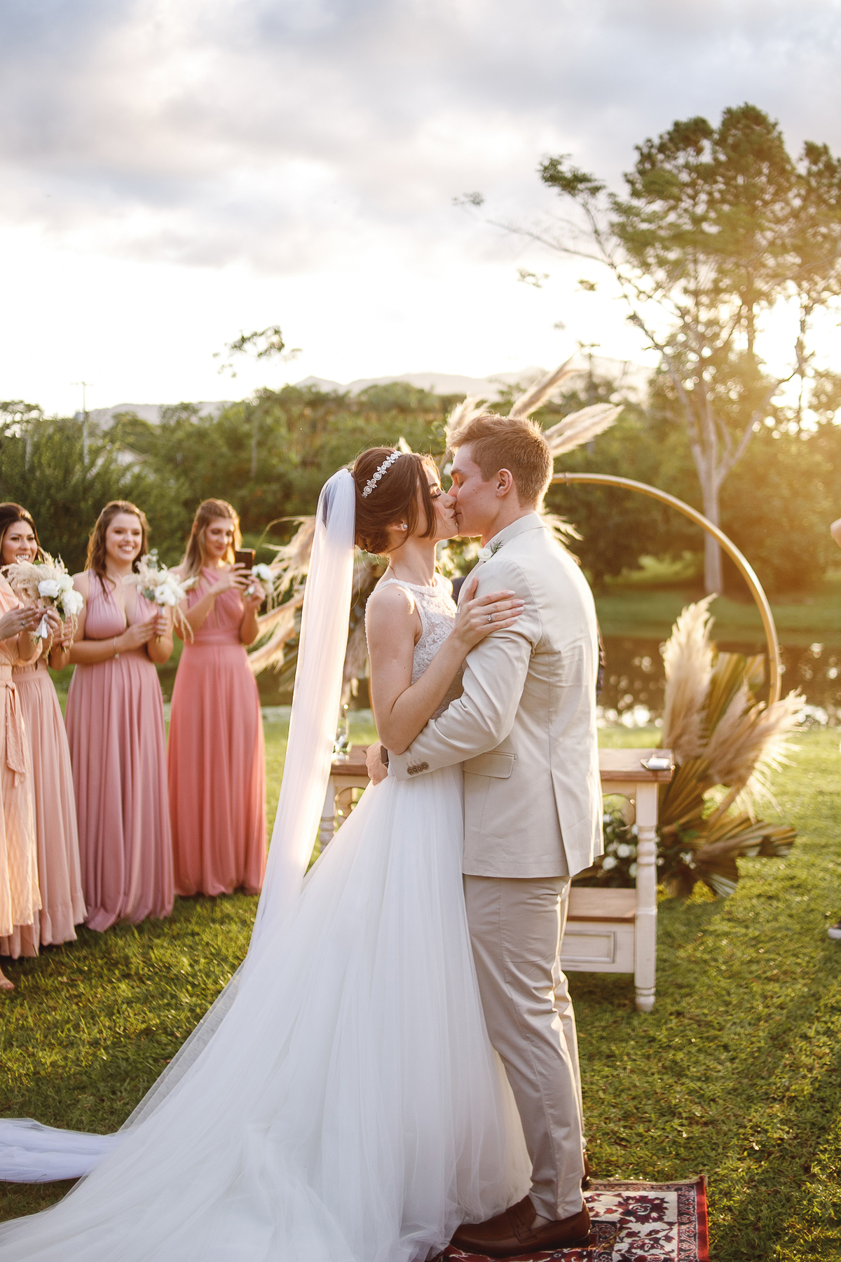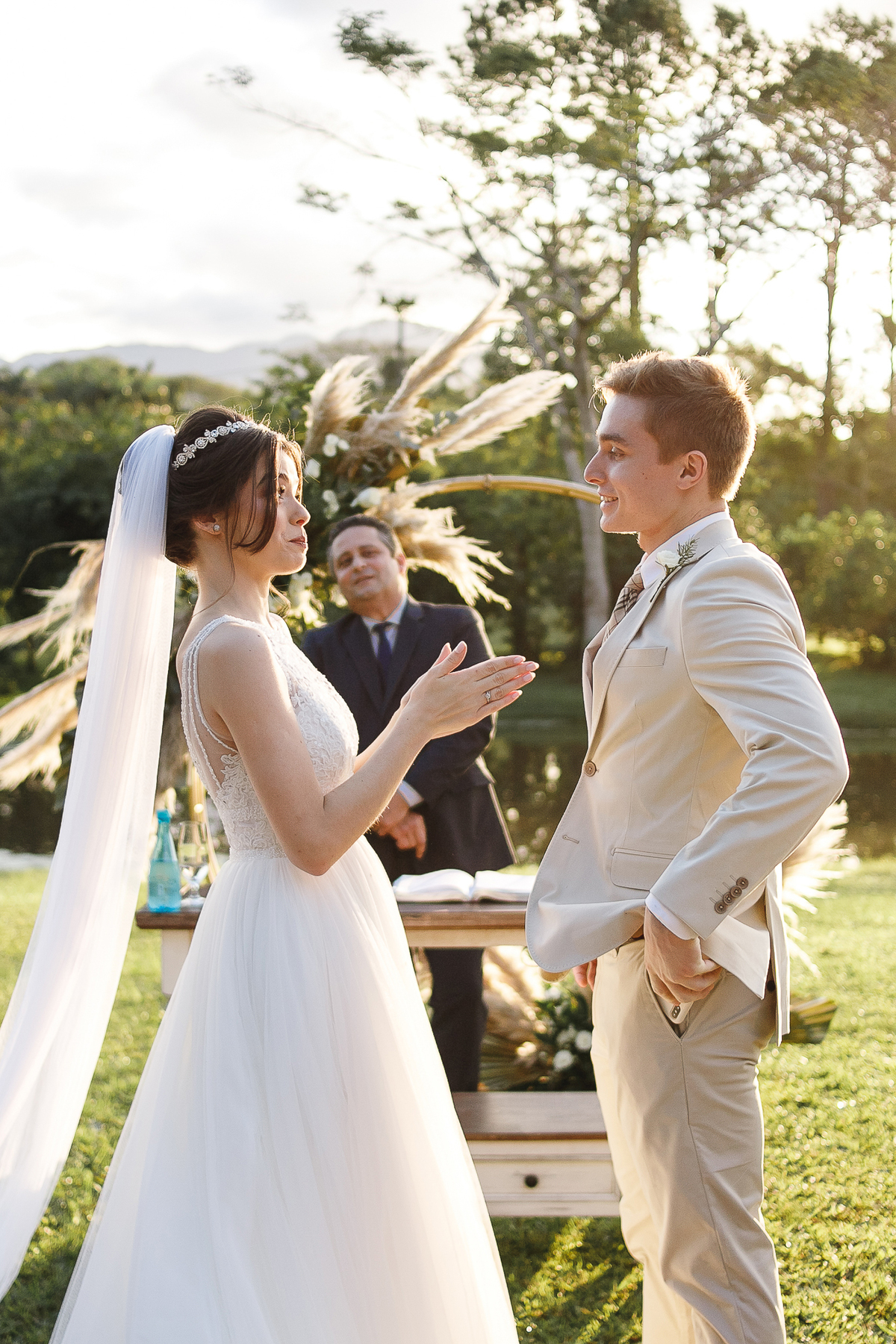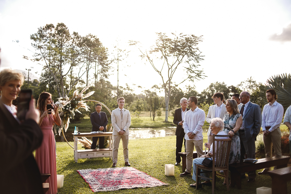 A semana inteira foi de céu fechado e nuvens carregadas. O clima parecia querer testar a calma de todo mundo. Mas no grande dia, algo mágico aconteceu: o céu ainda estava nublado quando a Ruama chegou, mas foi só ela colocar o pé pra fora do carro que o sol surgiu, com força e intenção. E QUE SOL! Um dourado quente e acolhedor tomou conta do horizonte e permaneceu ali, firme, iluminando toda a cerimônia. Era como se o universo tivesse esperado aquele exato momento para abrir o céu.
