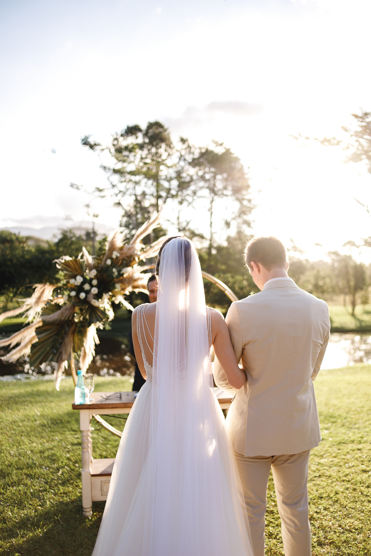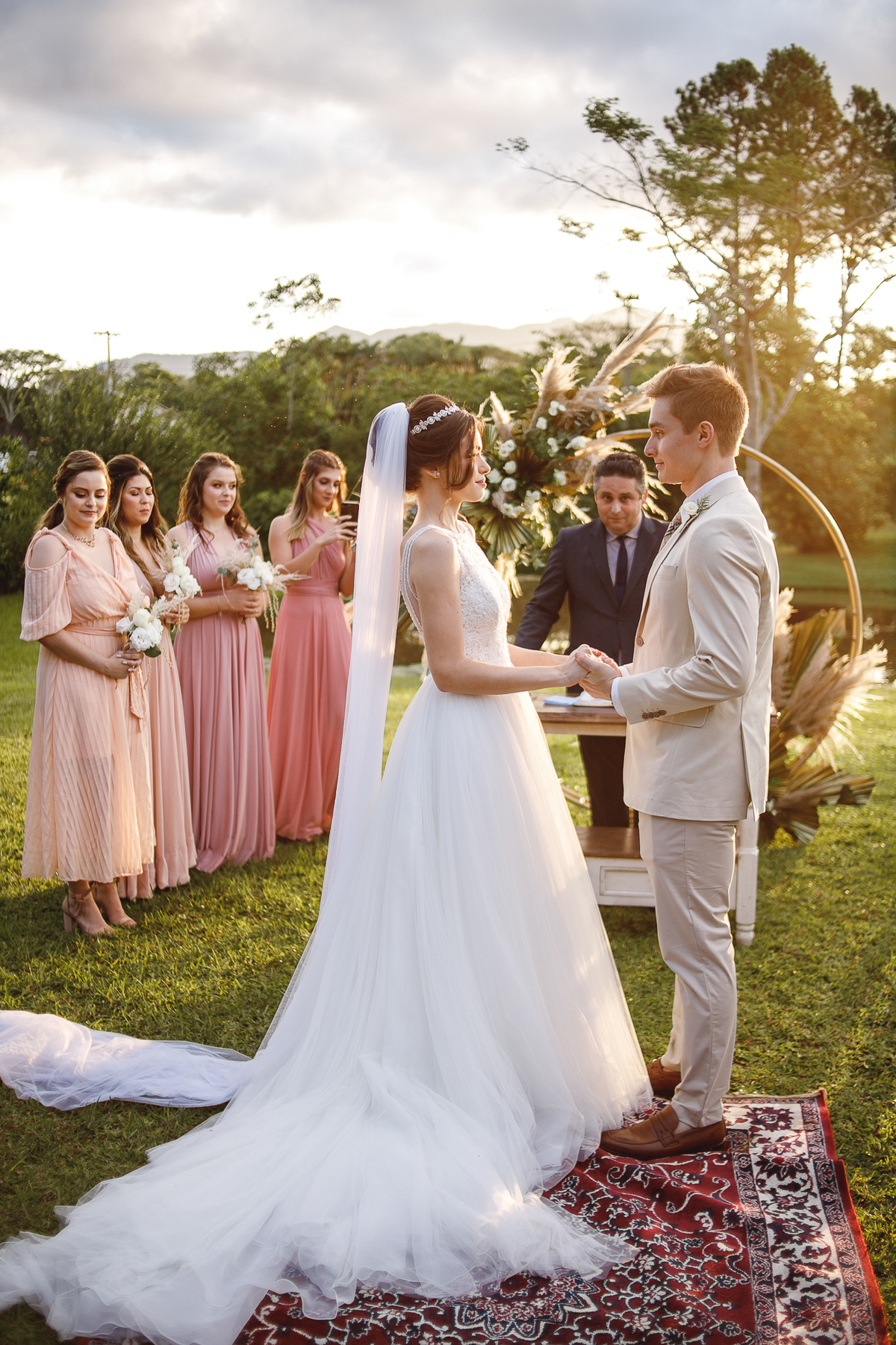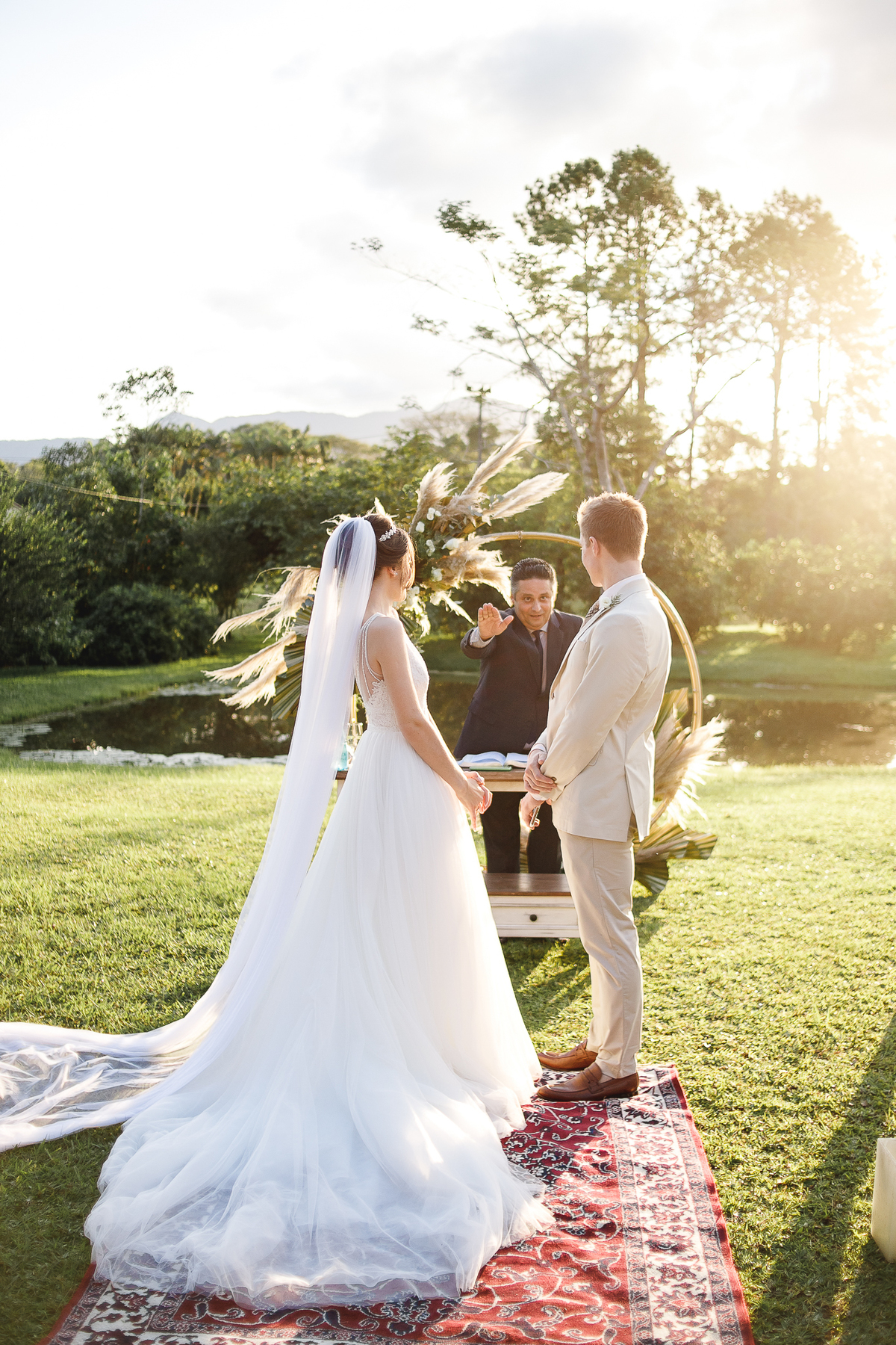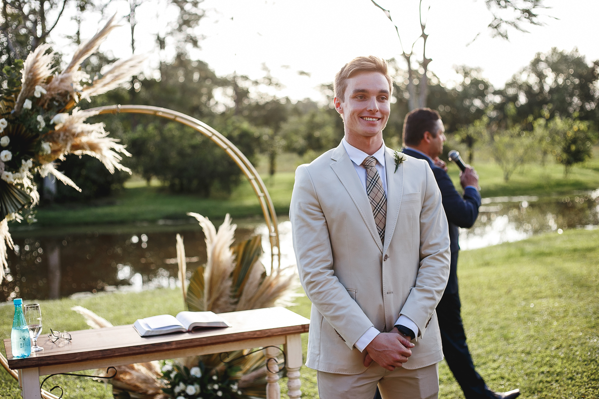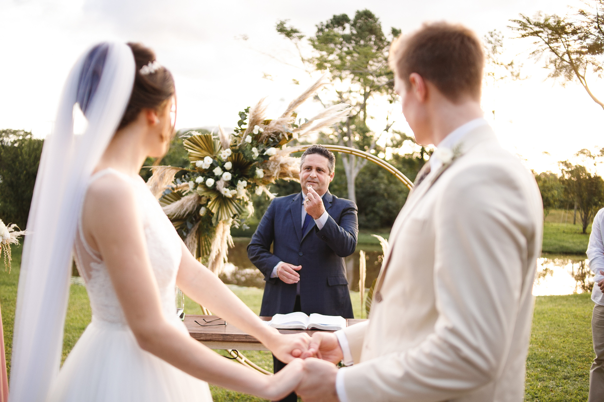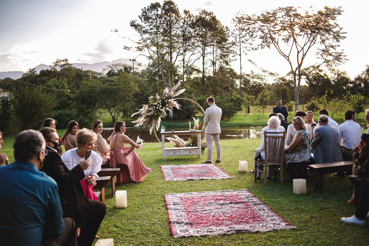 A semana inteira foi de céu fechado e nuvens carregadas. O clima parecia querer testar a calma de todo mundo. Mas no grande dia, algo mágico aconteceu: o céu ainda estava nublado quando a Ruama chegou, mas foi só ela colocar o pé pra fora do carro que o sol surgiu, com força e intenção. E QUE SOL! Um dourado quente e acolhedor tomou conta do horizonte e permaneceu ali, firme, iluminando toda a cerimônia. Era como se o universo tivesse esperado aquele exato momento para abrir o céu.