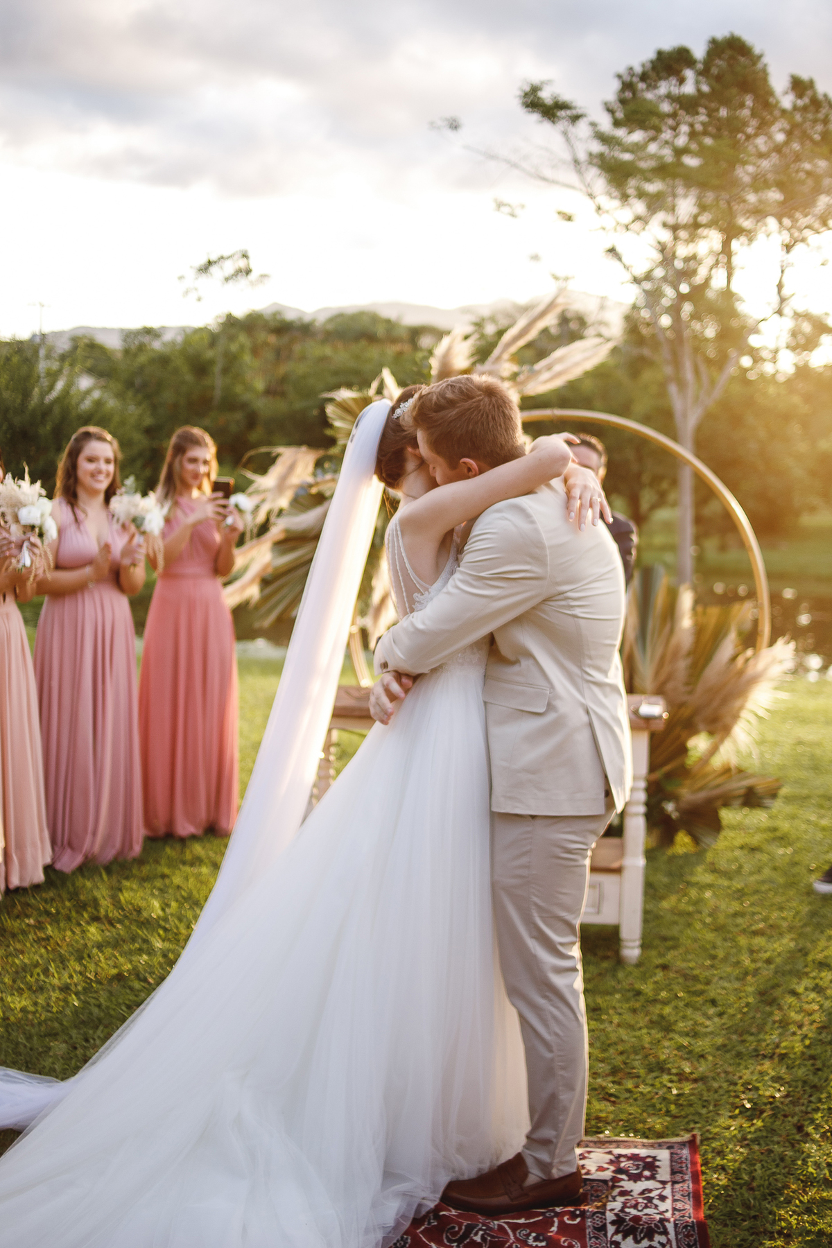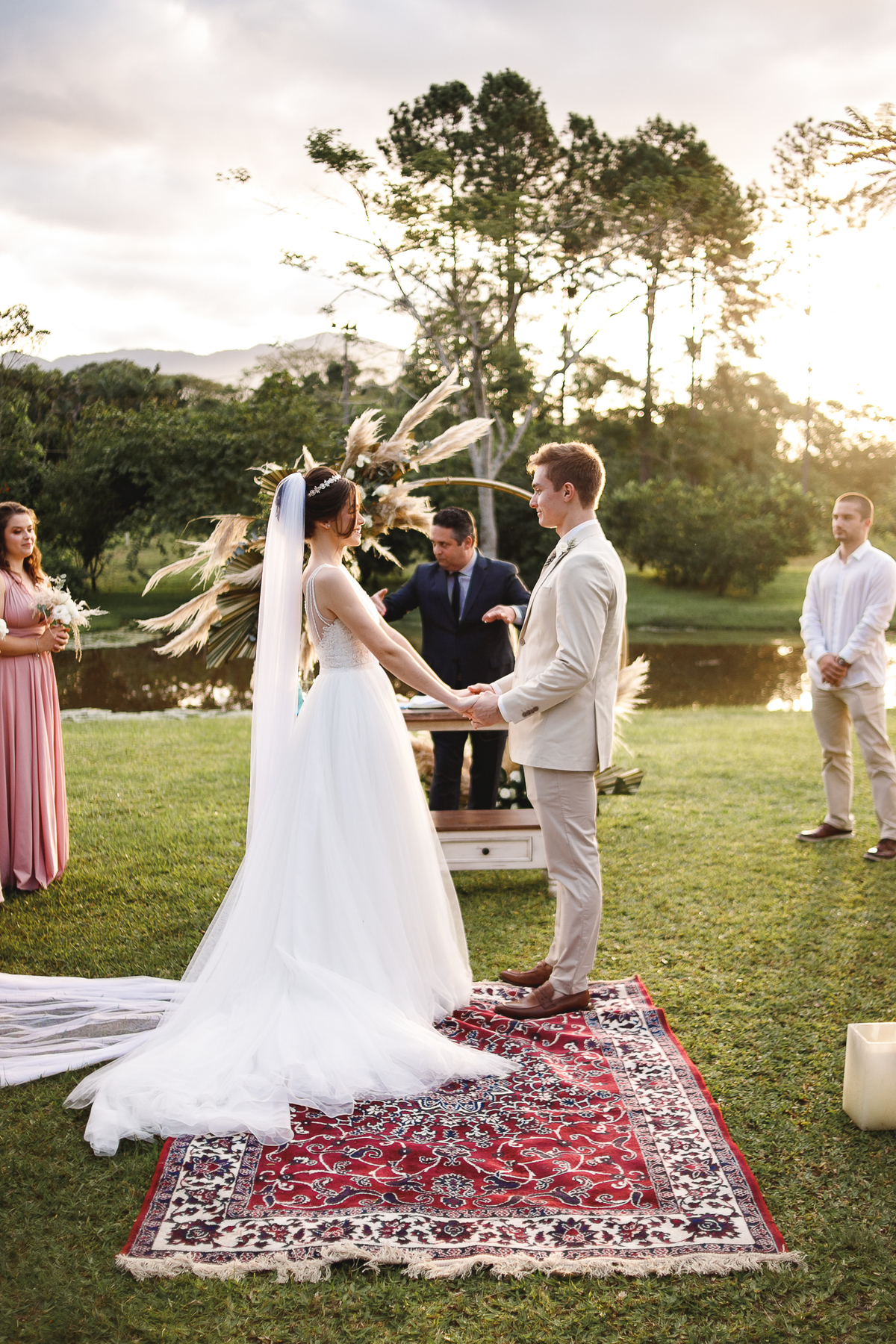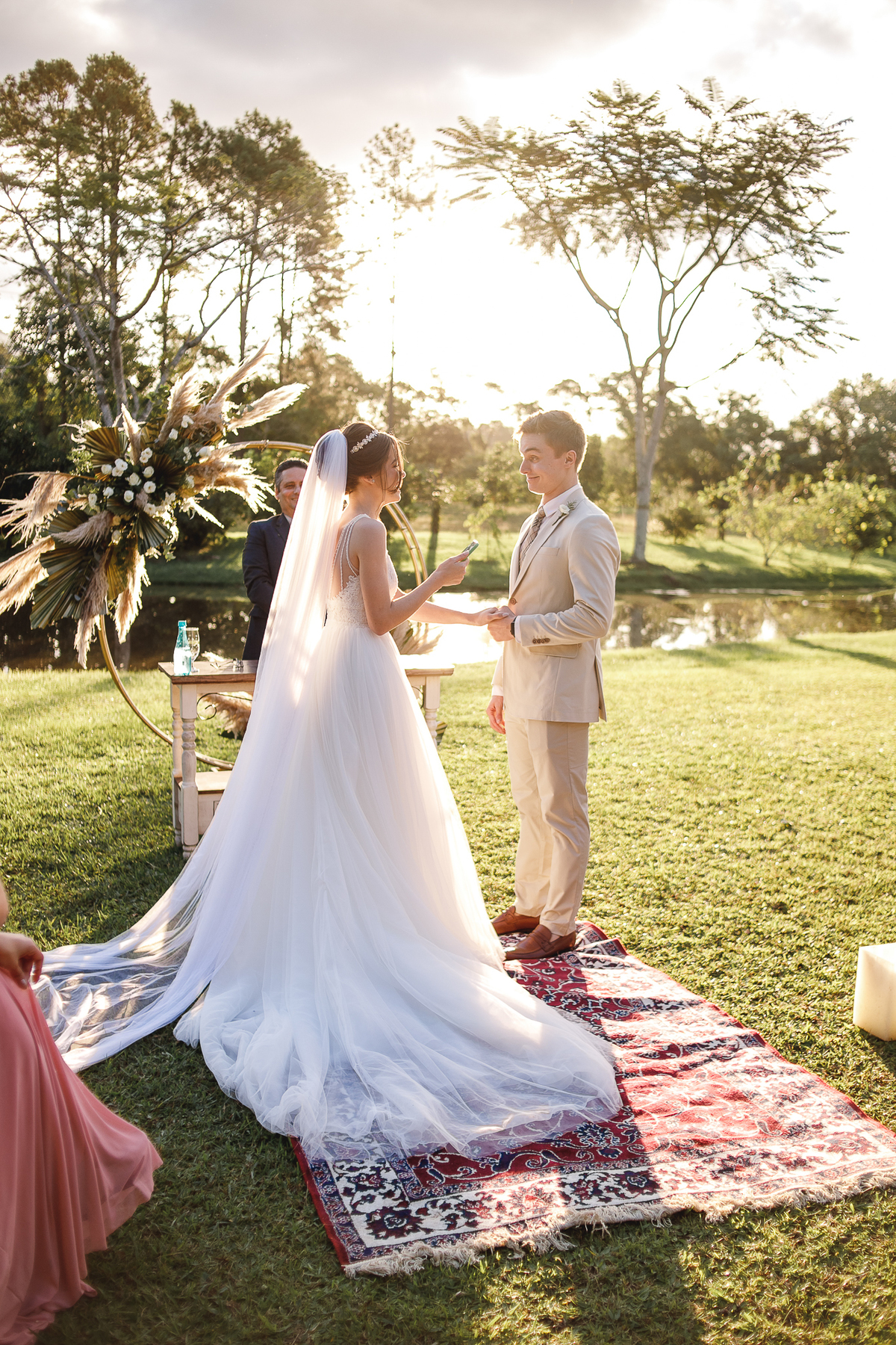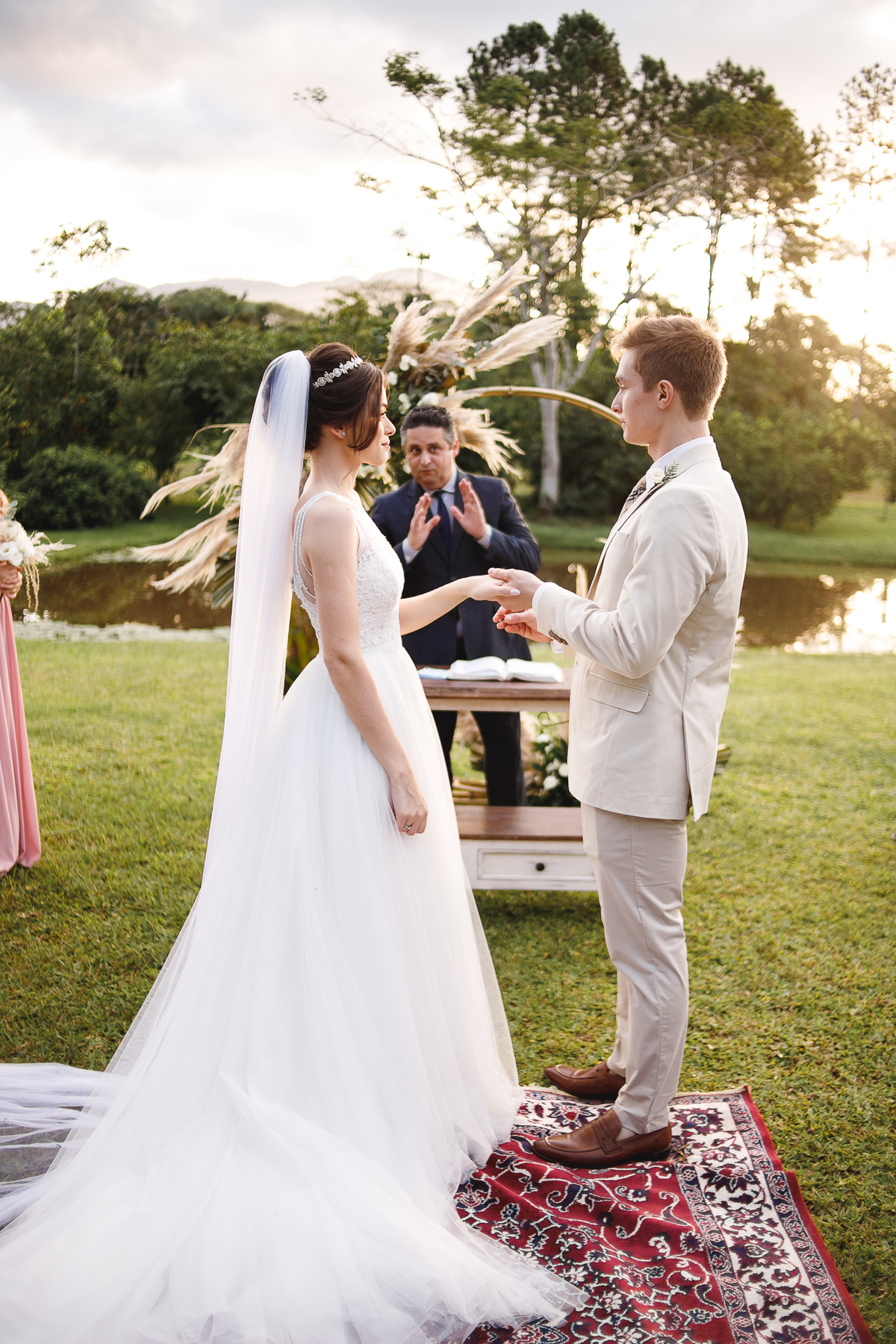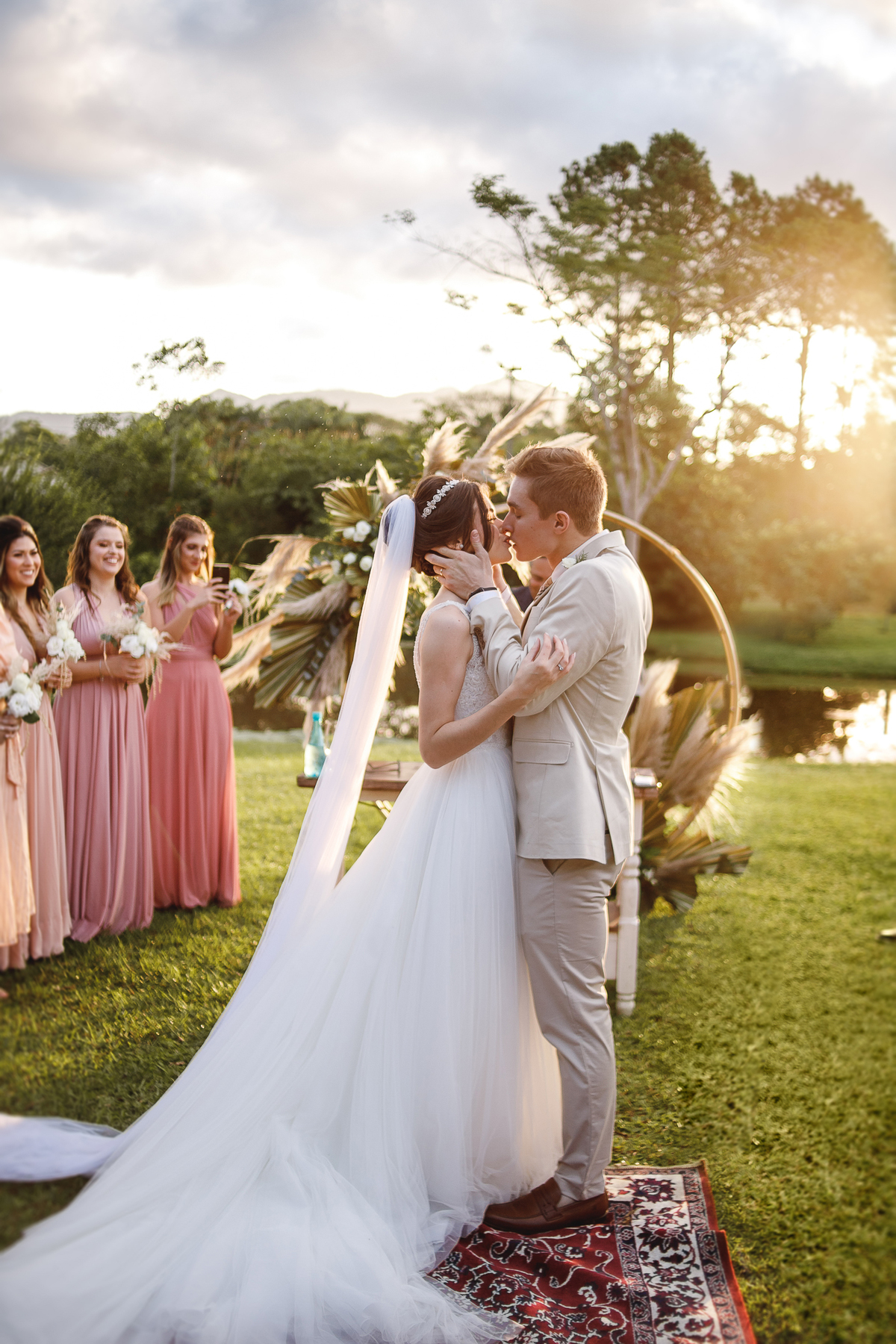 A semana inteira foi de céu fechado e nuvens carregadas. O clima parecia querer testar a calma de todo mundo. Mas no grande dia, algo mágico aconteceu: o céu ainda estava nublado quando a Ruama chegou, mas foi só ela colocar o pé pra fora do carro que o sol surgiu, com força e intenção. E QUE SOL! Um dourado quente e acolhedor tomou conta do horizonte e permaneceu ali, firme, iluminando toda a cerimônia. Era como se o universo tivesse esperado aquele exato momento para abrir o céu.