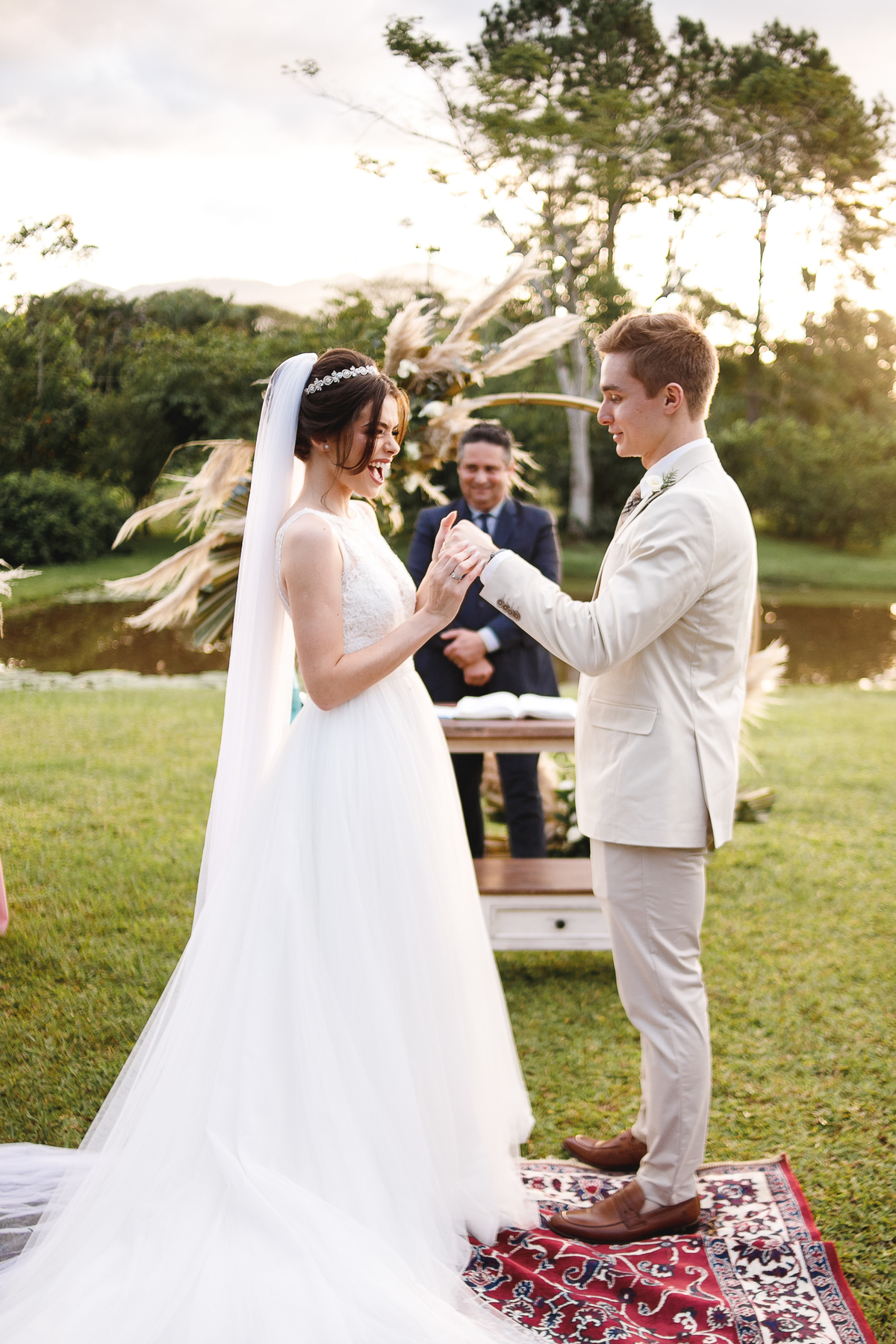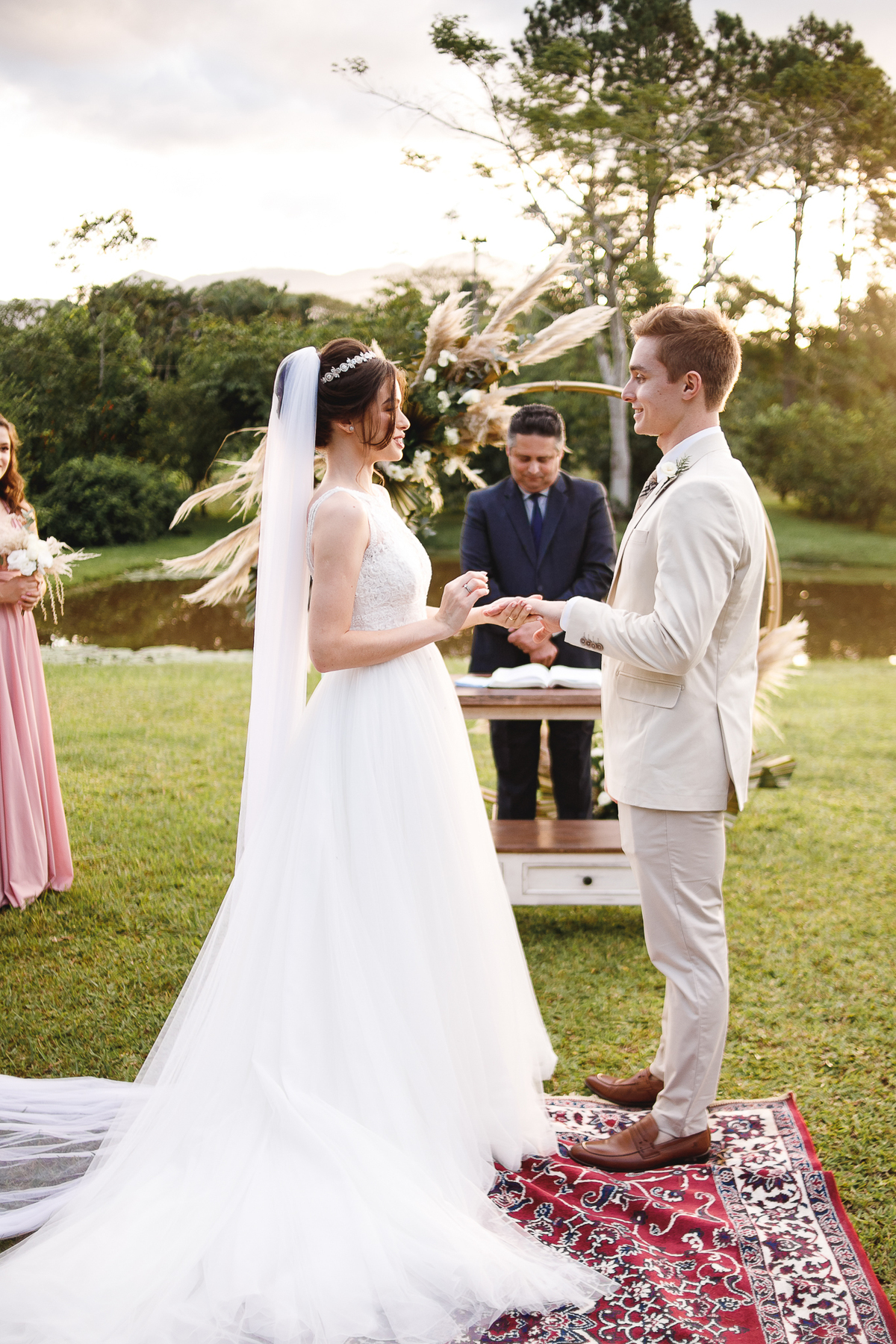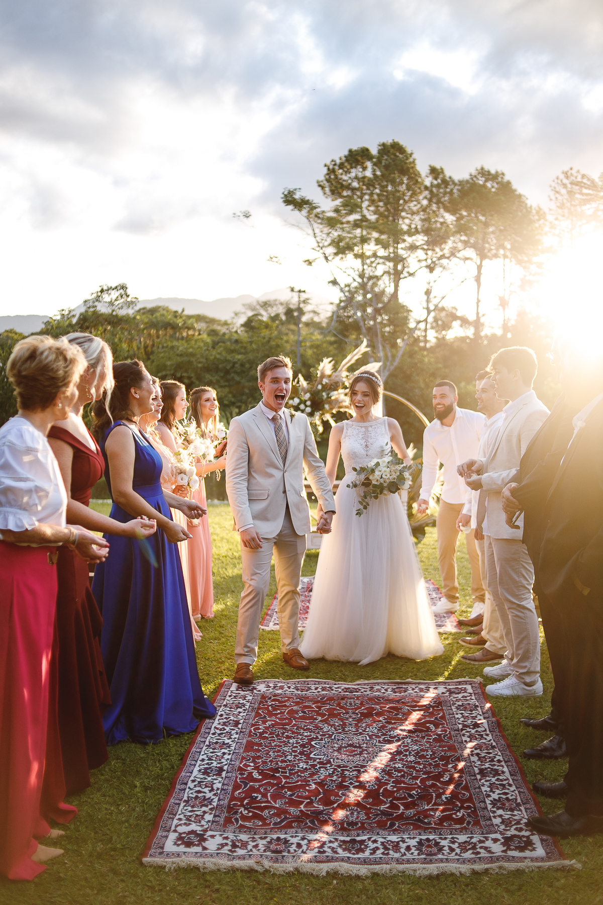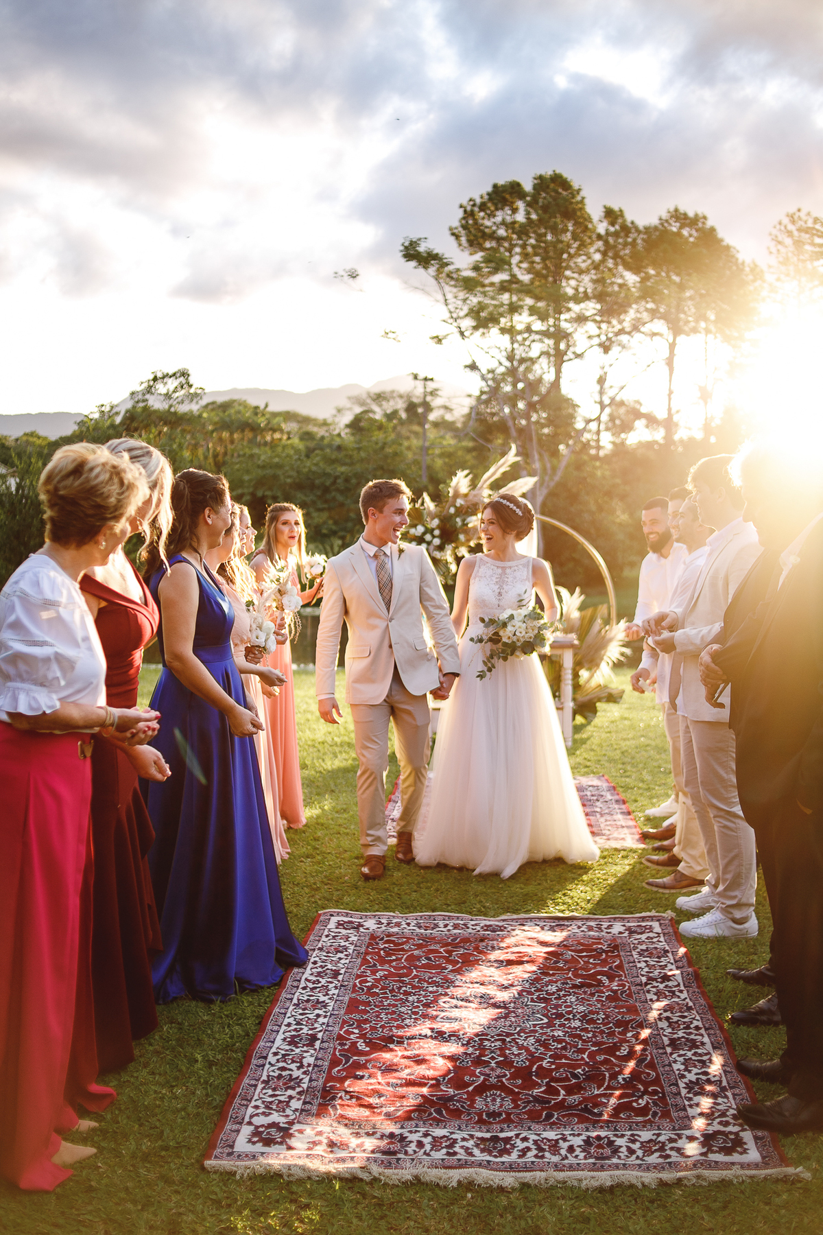 A semana inteira foi de céu fechado e nuvens carregadas. O clima parecia querer testar a calma de todo mundo. Mas no grande dia, algo mágico aconteceu: o céu ainda estava nublado quando a Ruama chegou, mas foi só ela colocar o pé pra fora do carro que o sol surgiu, com força e intenção. E QUE SOL! Um dourado quente e acolhedor tomou conta do horizonte e permaneceu ali, firme, iluminando toda a cerimônia. Era como se o universo tivesse esperado aquele exato momento para abrir o céu.