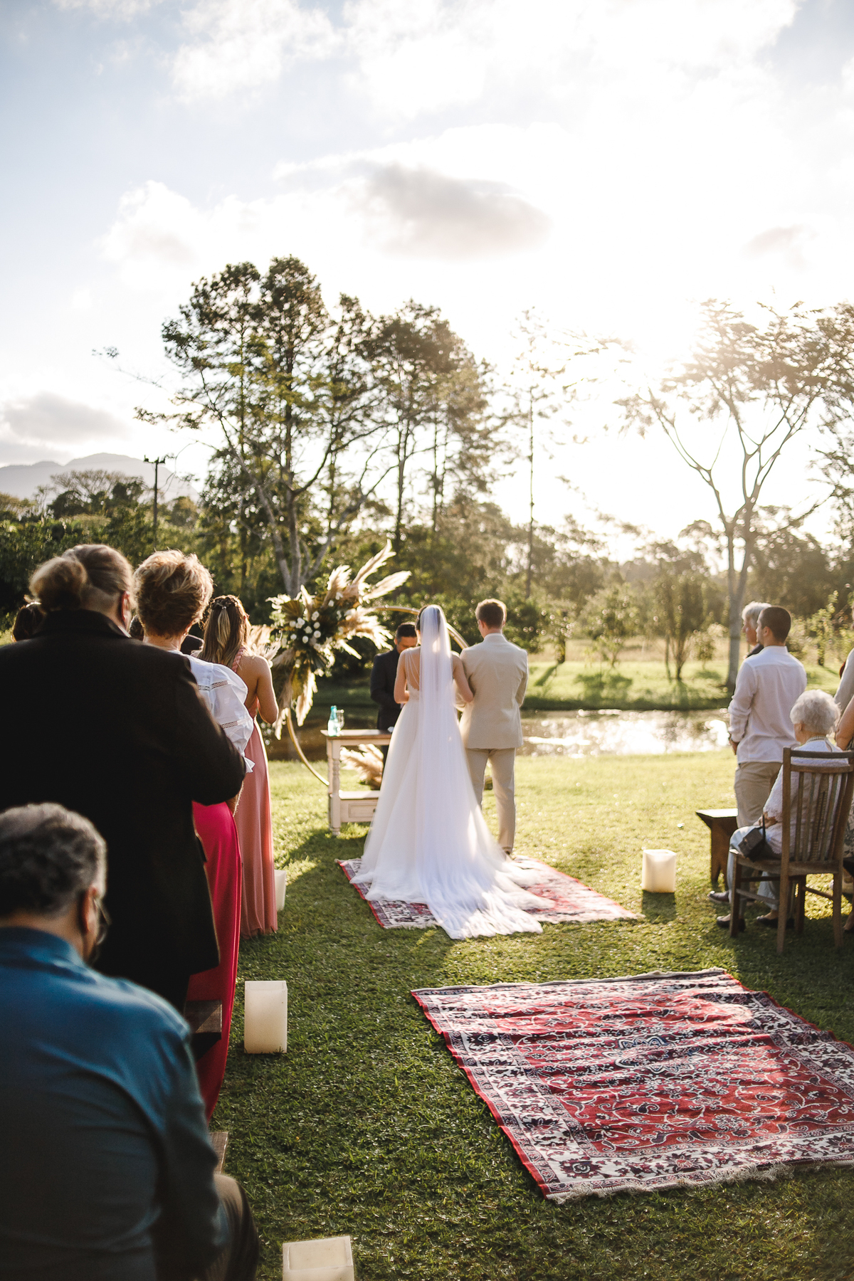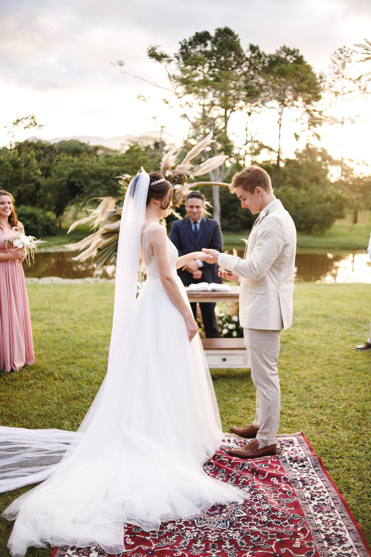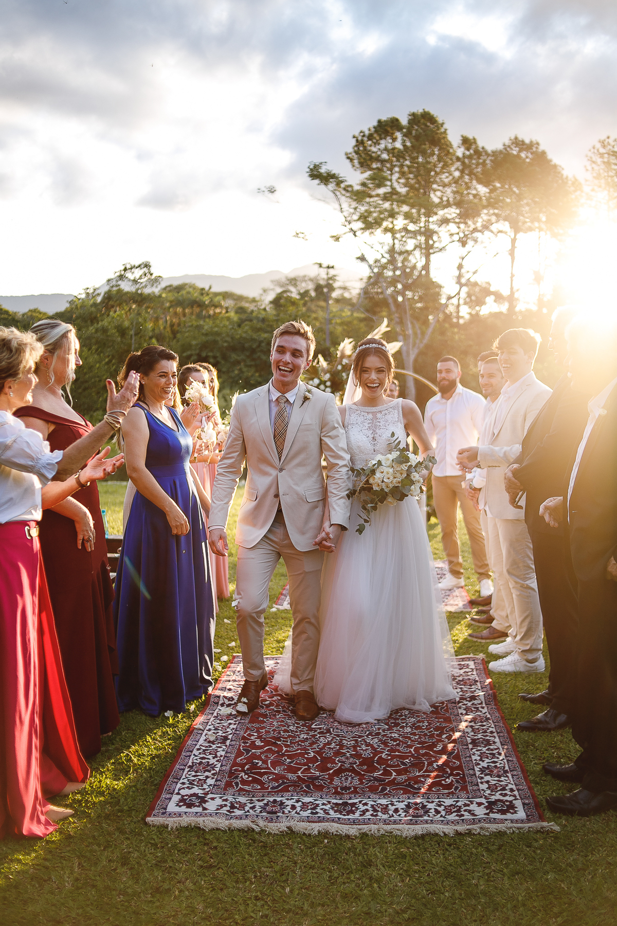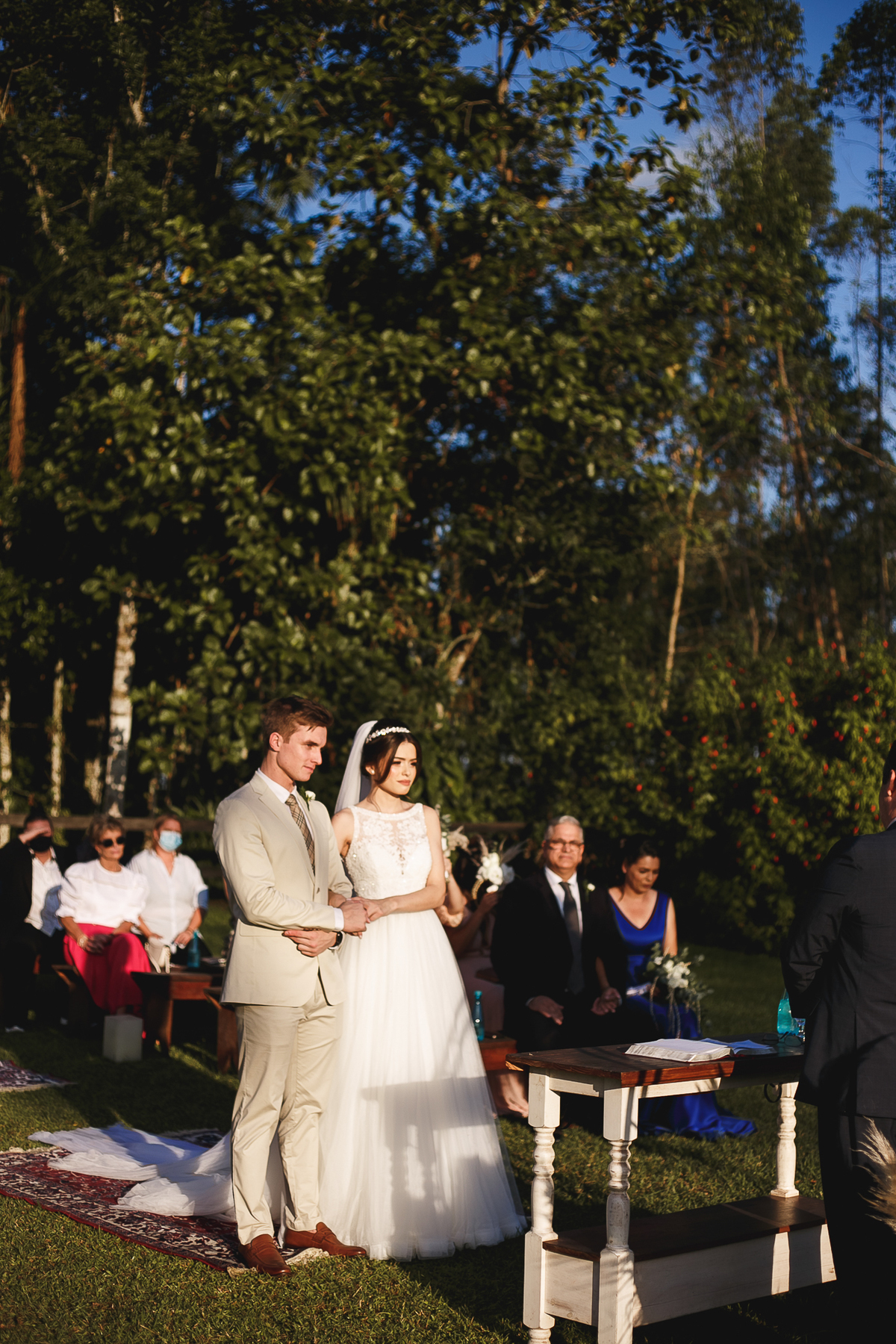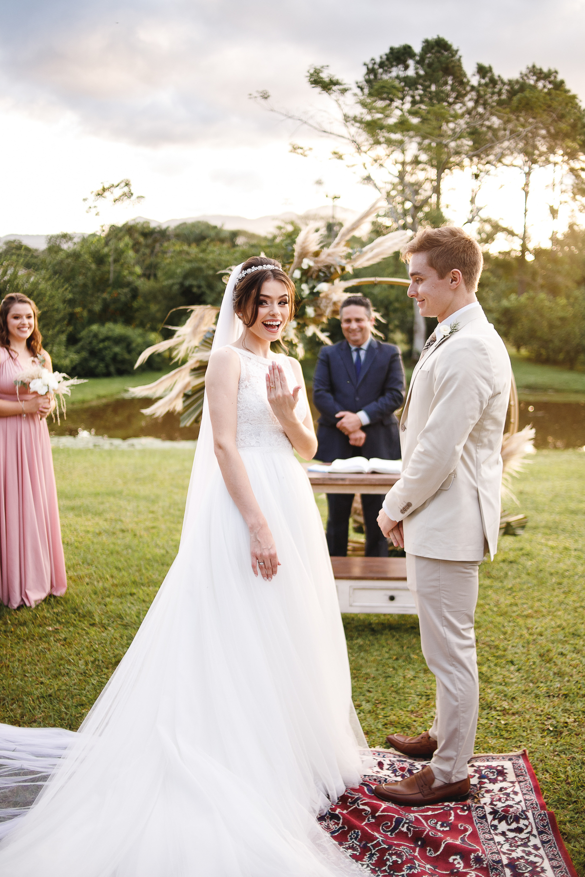 A semana inteira foi de céu fechado e nuvens carregadas. O clima parecia querer testar a calma de todo mundo. Mas no grande dia, algo mágico aconteceu: o céu ainda estava nublado quando a Ruama chegou, mas foi só ela colocar o pé pra fora do carro que o sol surgiu, com força e intenção. E QUE SOL! Um dourado quente e acolhedor tomou conta do horizonte e permaneceu ali, firme, iluminando toda a cerimônia. Era como se o universo tivesse esperado aquele exato momento para abrir o céu.