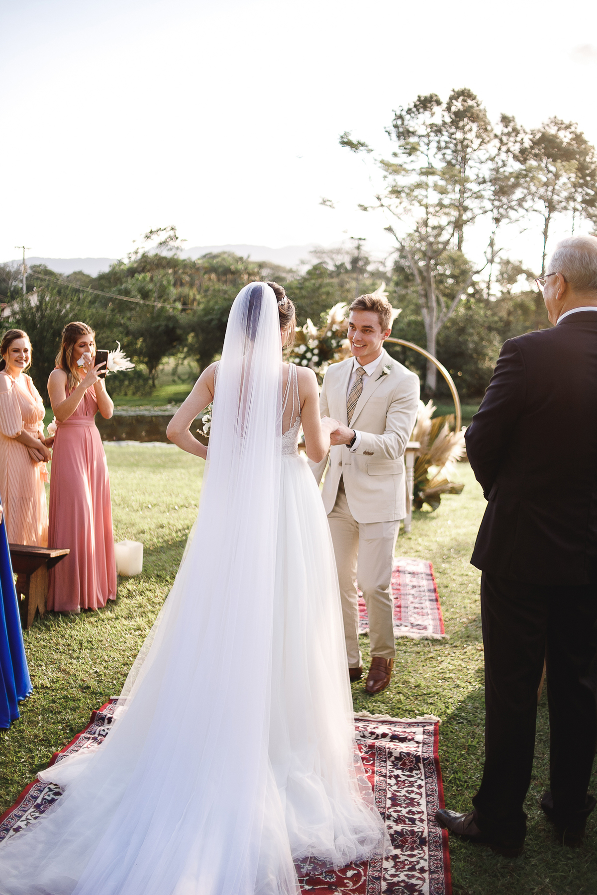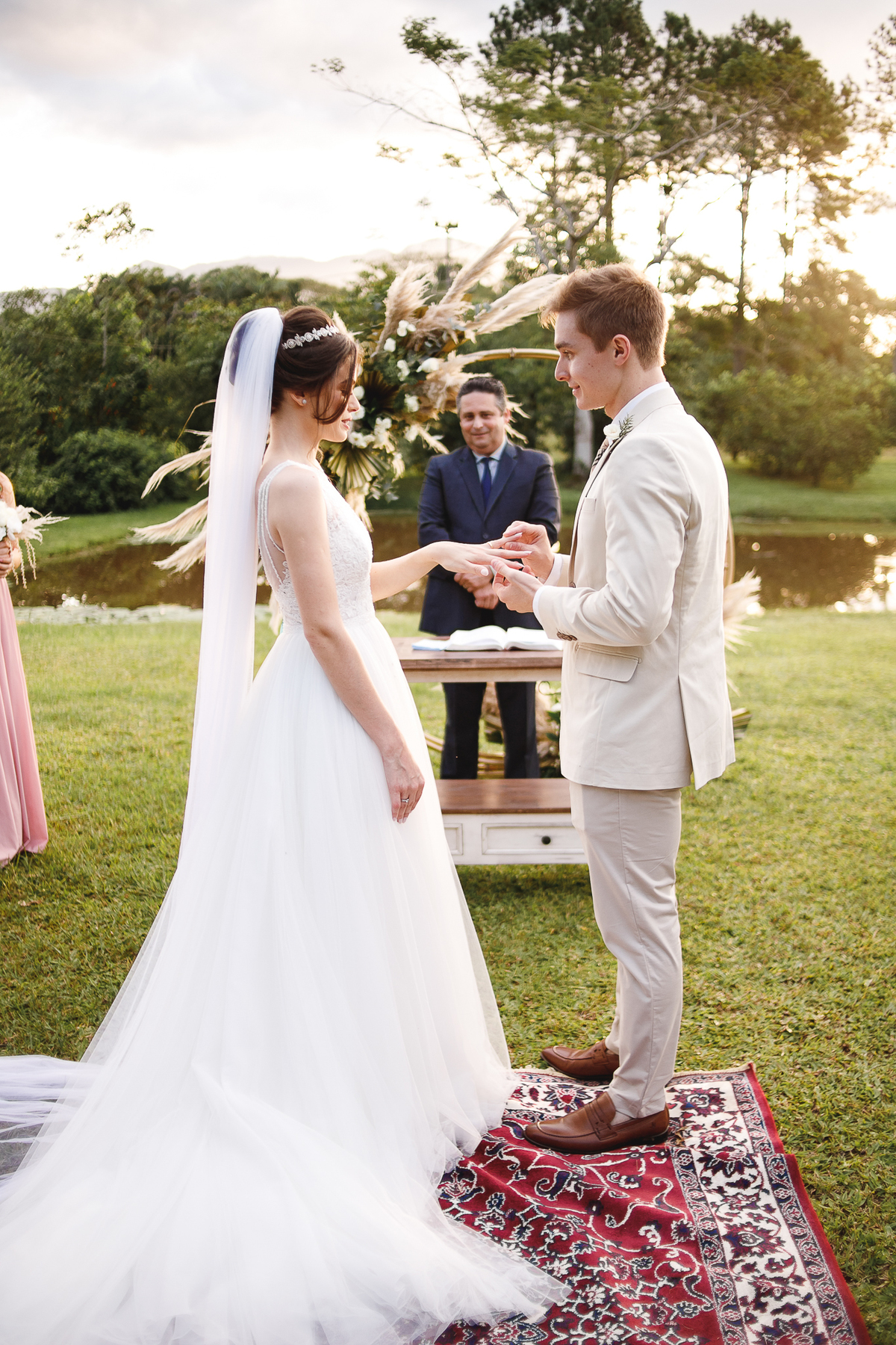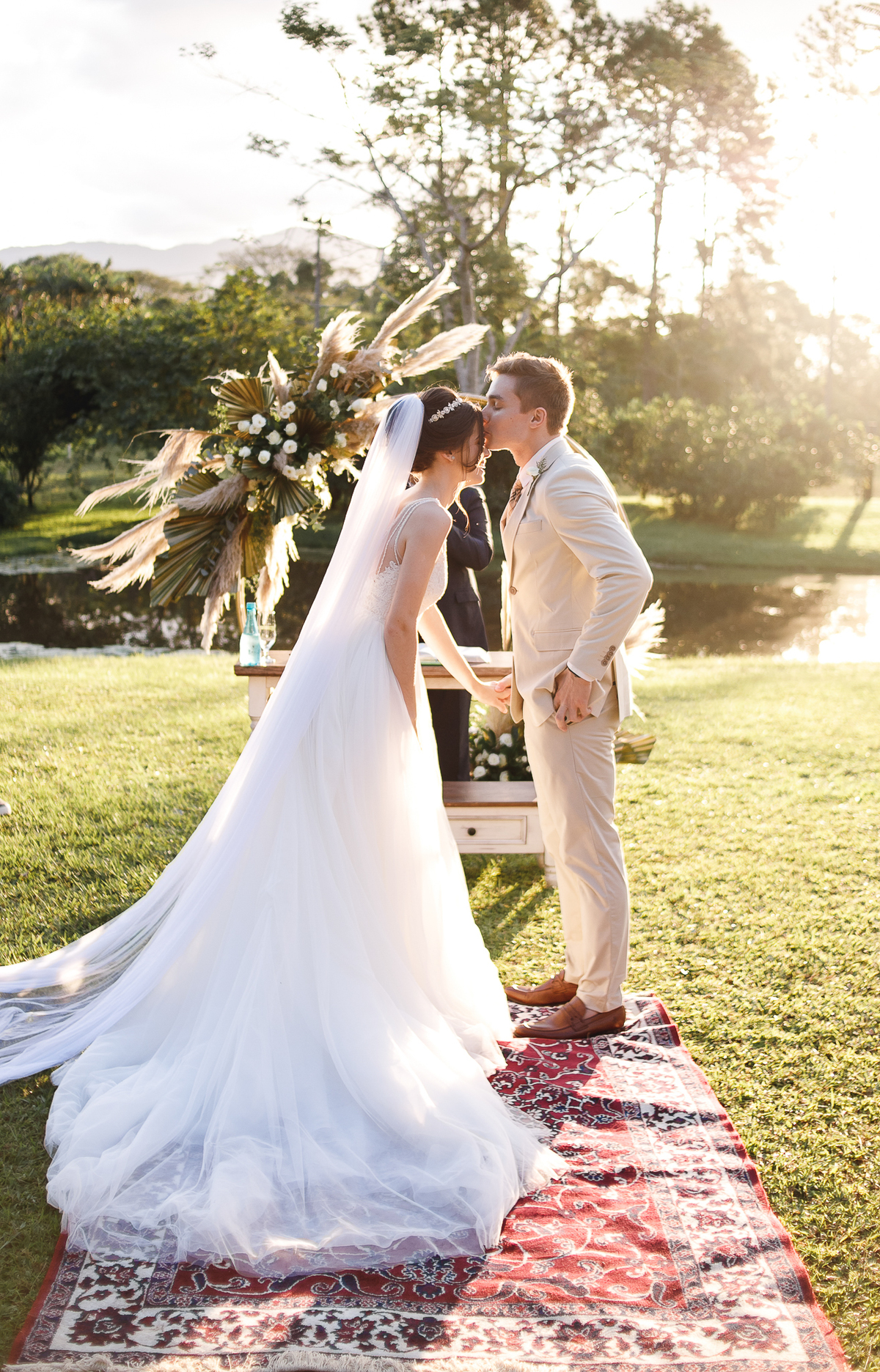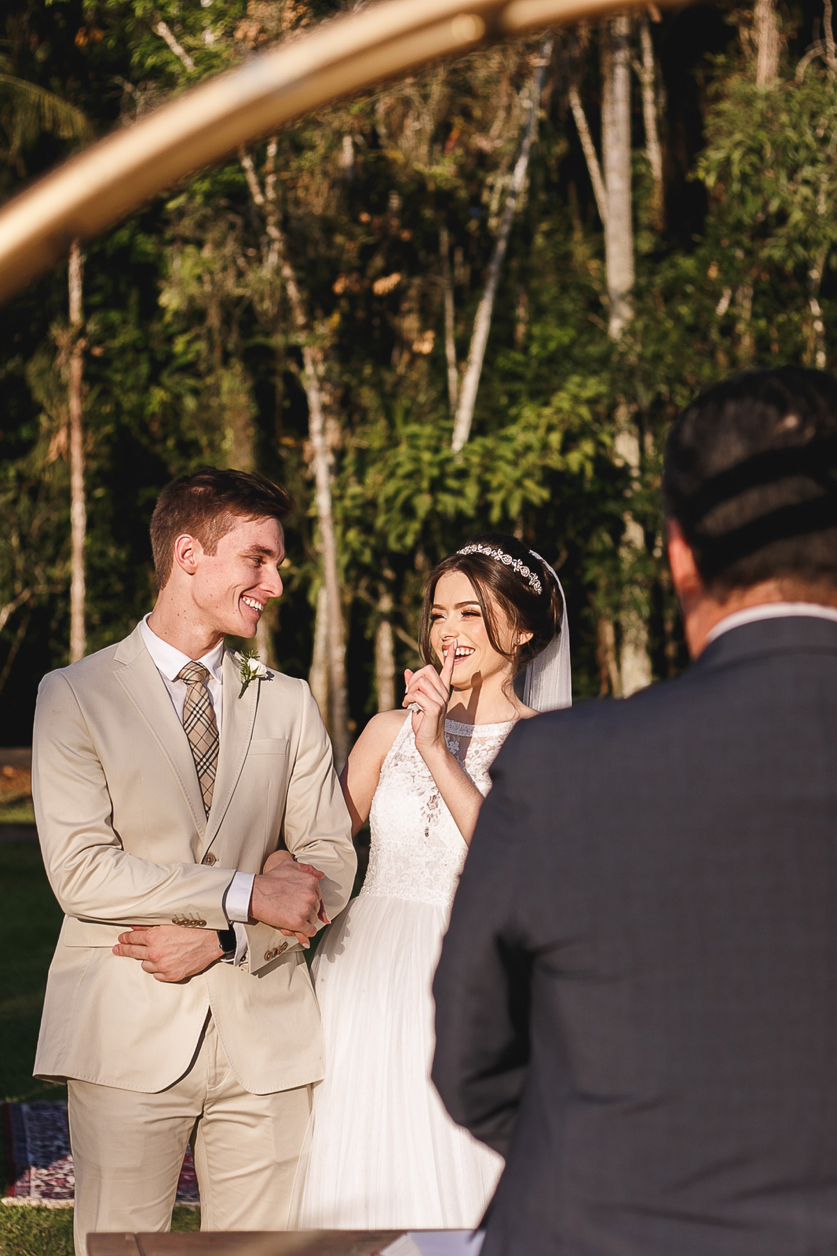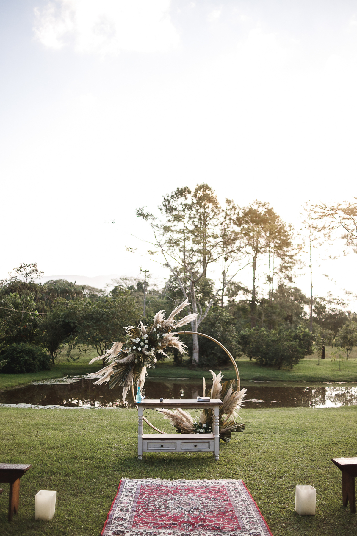 A semana inteira foi de céu fechado e nuvens carregadas. O clima parecia querer testar a calma de todo mundo. Mas no grande dia, algo mágico aconteceu: o céu ainda estava nublado quando a Ruama chegou, mas foi só ela colocar o pé pra fora do carro que o sol surgiu, com força e intenção. E QUE SOL! Um dourado quente e acolhedor tomou conta do horizonte e permaneceu ali, firme, iluminando toda a cerimônia. Era como se o universo tivesse esperado aquele exato momento para abrir o céu.