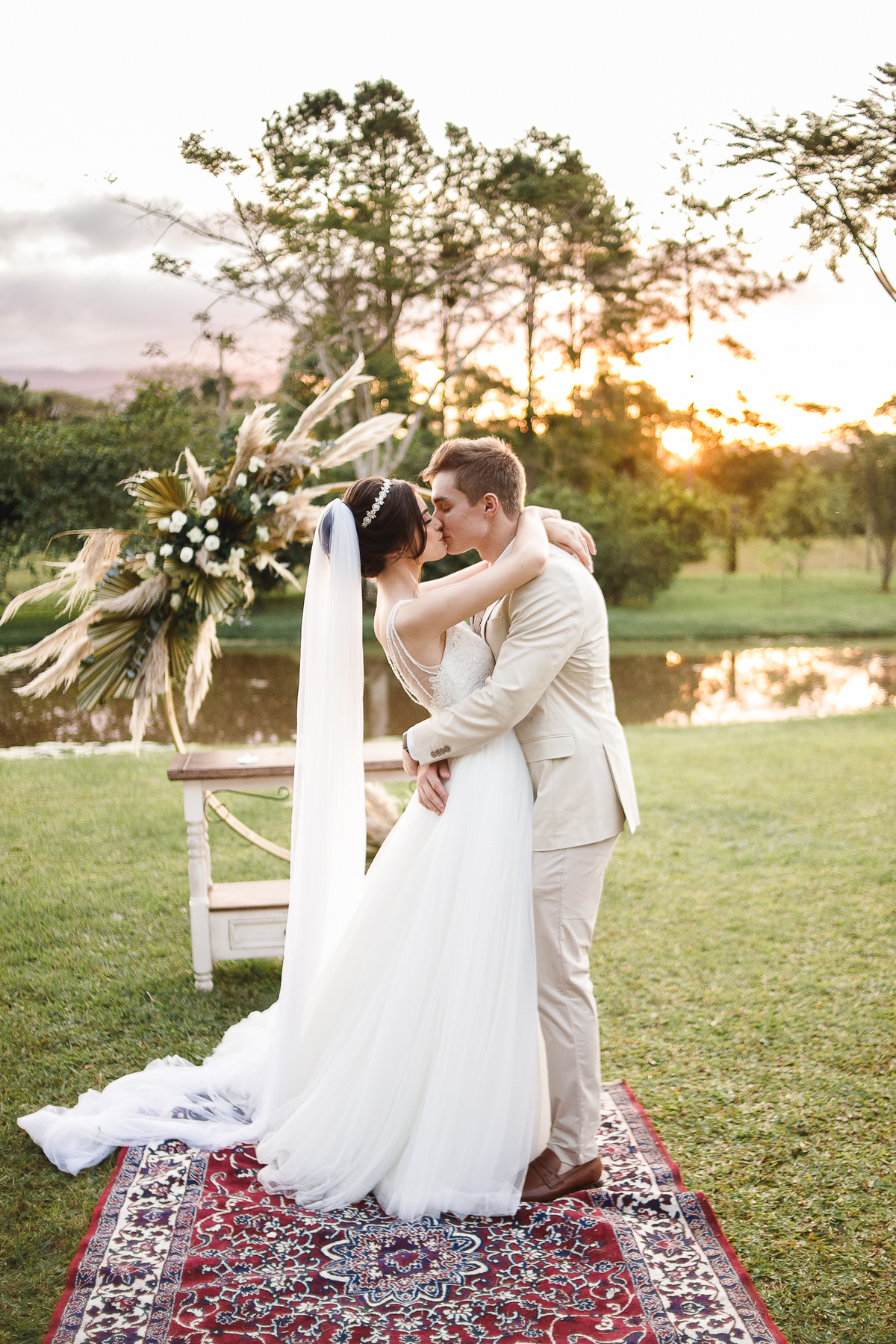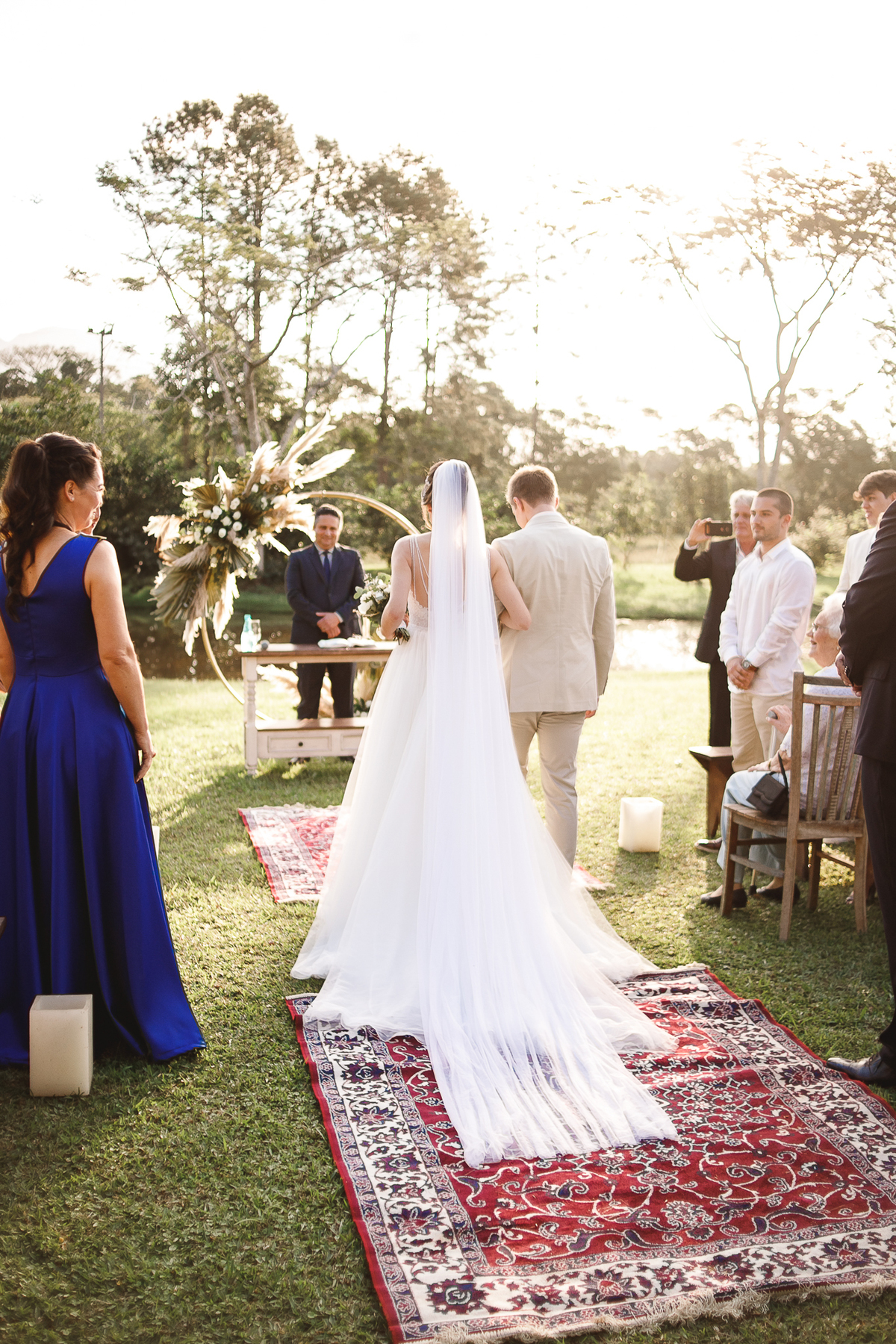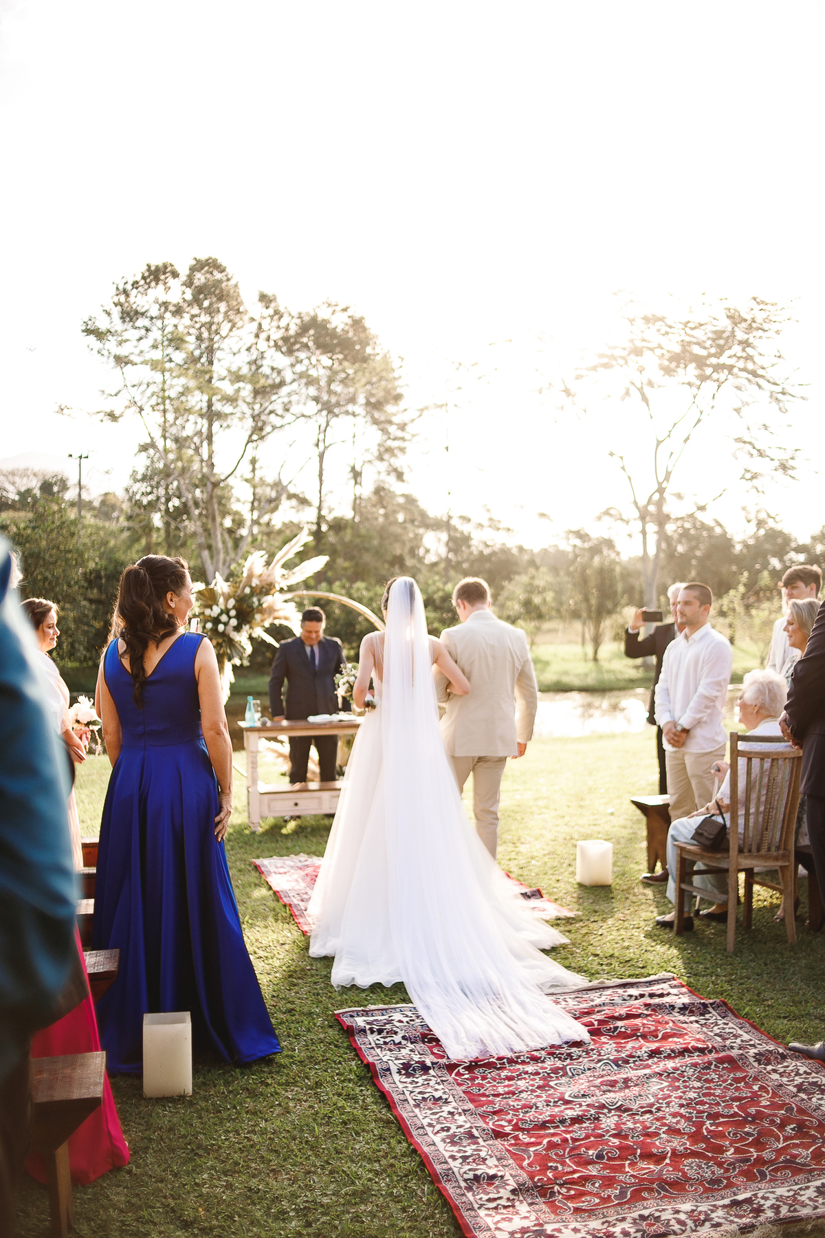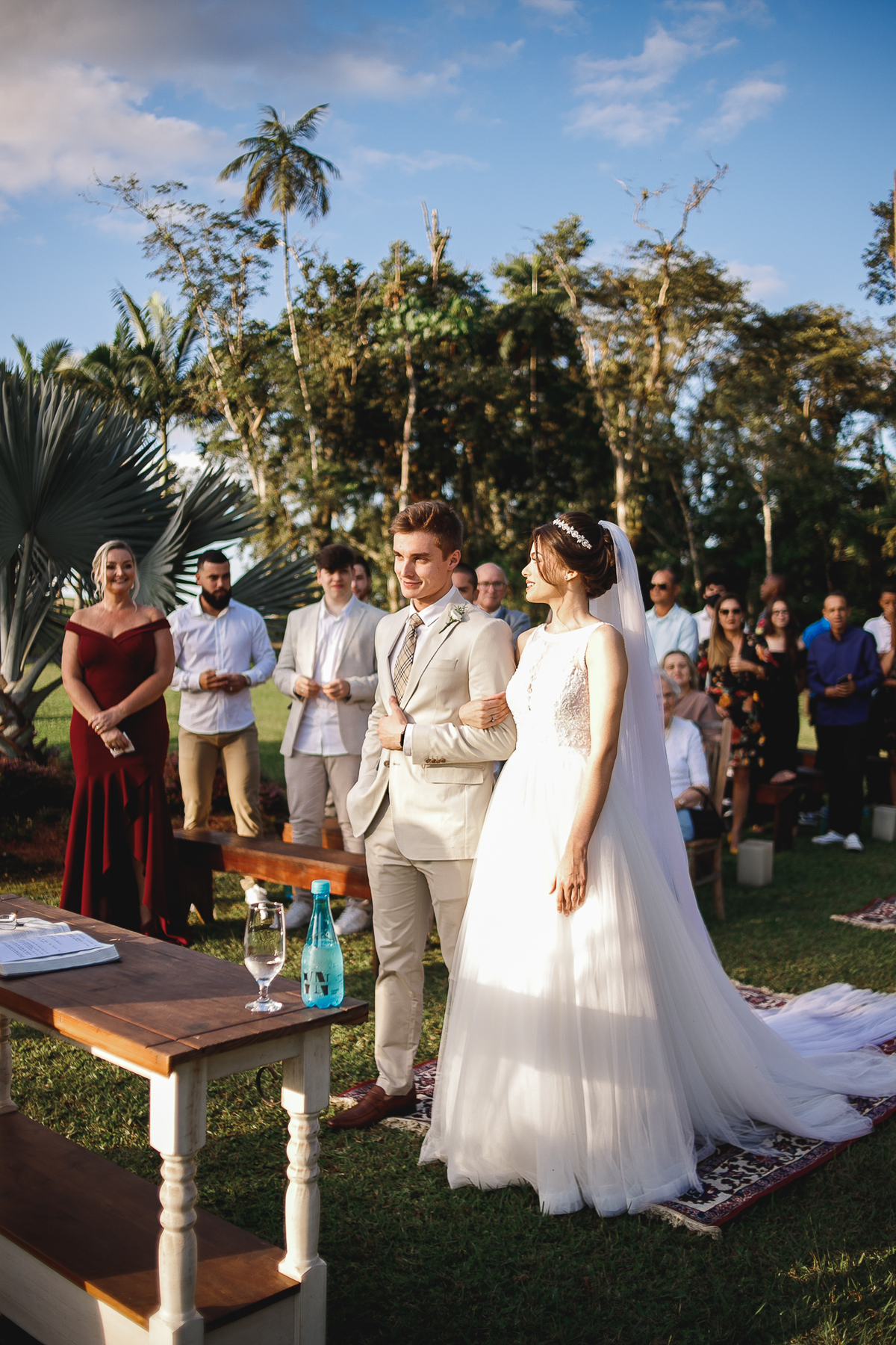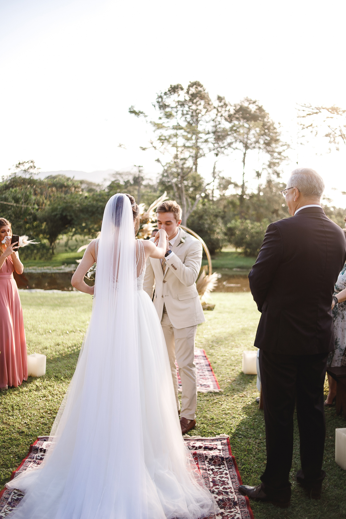 A semana inteira foi de céu fechado e nuvens carregadas. O clima parecia querer testar a calma de todo mundo. Mas no grande dia, algo mágico aconteceu: o céu ainda estava nublado quando a Ruama chegou, mas foi só ela colocar o pé pra fora do carro que o sol surgiu, com força e intenção. E QUE SOL! Um dourado quente e acolhedor tomou conta do horizonte e permaneceu ali, firme, iluminando toda a cerimônia. Era como se o universo tivesse esperado aquele exato momento para abrir o céu.