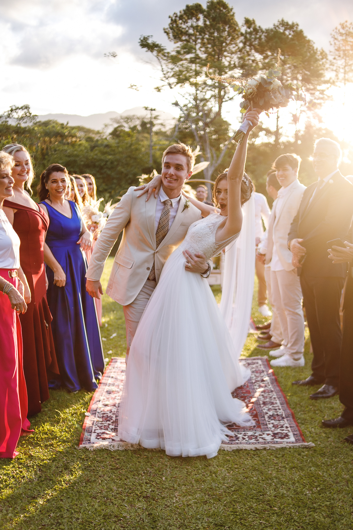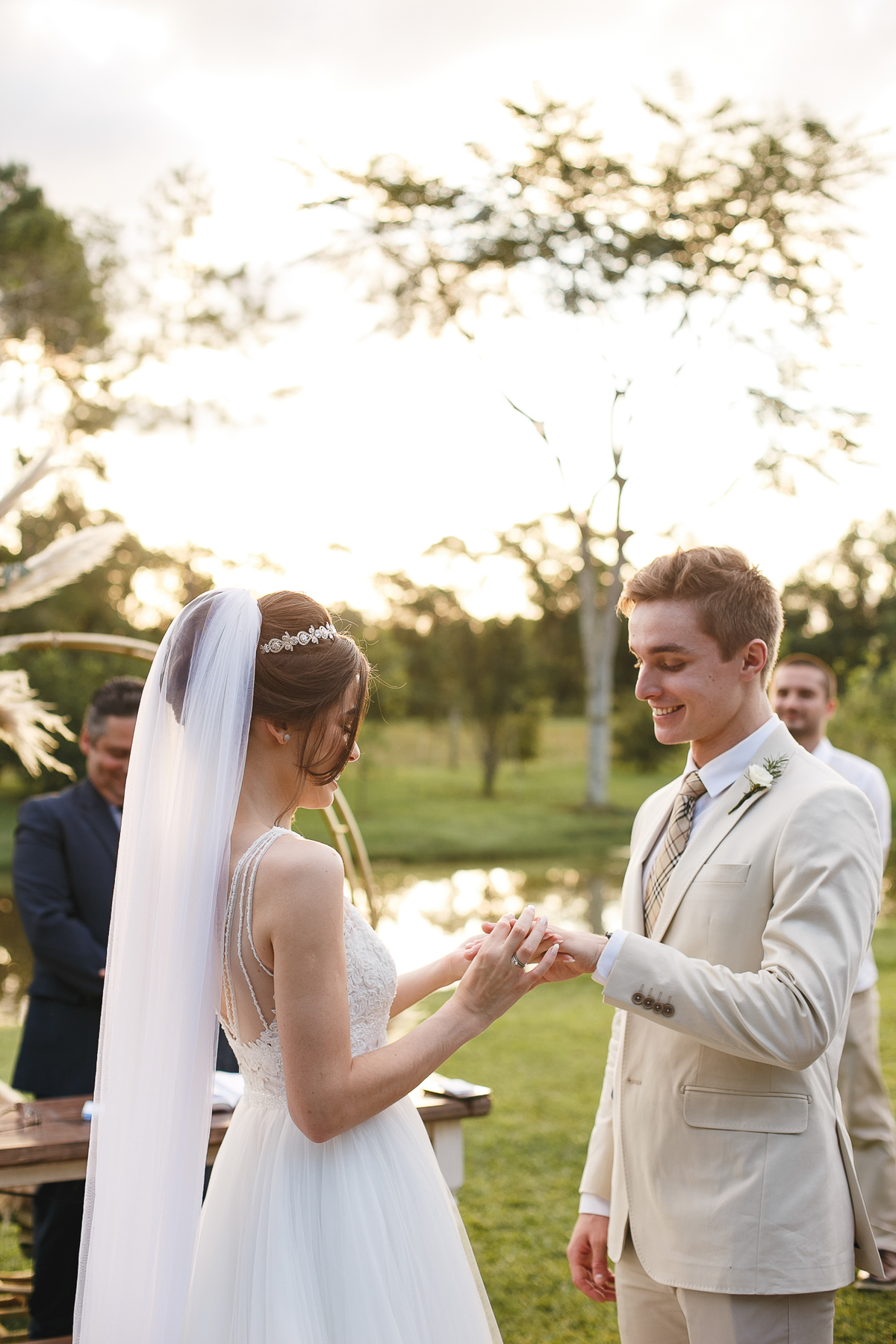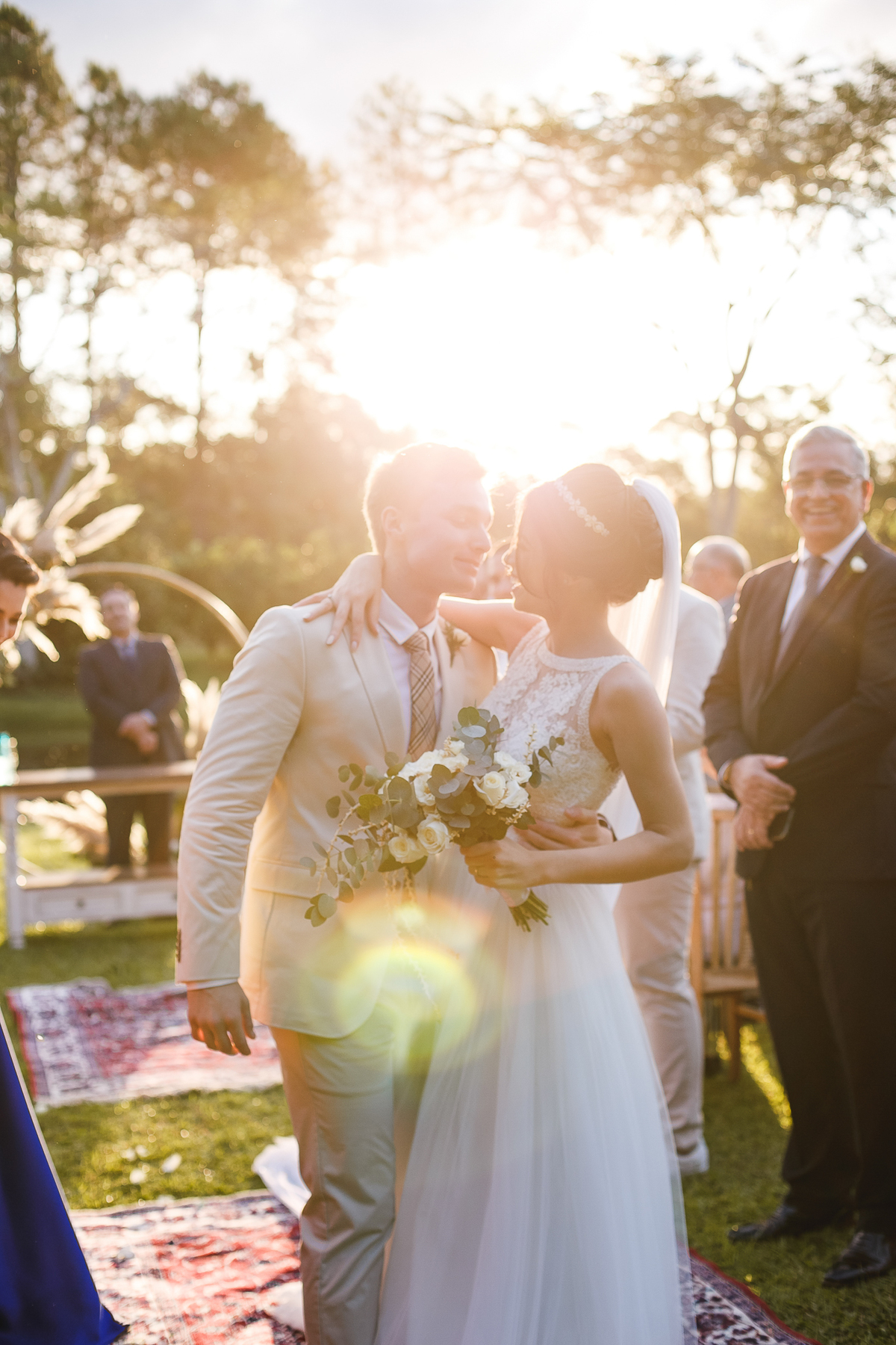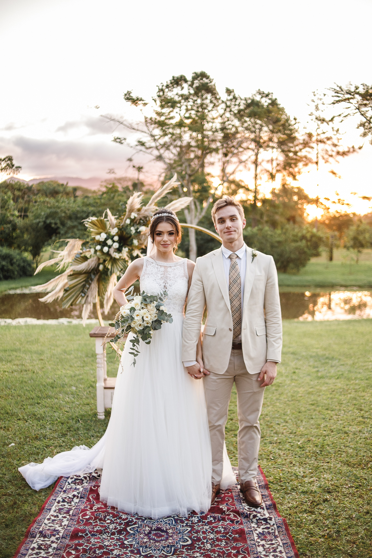 A semana inteira foi de céu fechado e nuvens carregadas. O clima parecia querer testar a calma de todo mundo. Mas no grande dia, algo mágico aconteceu: o céu ainda estava nublado quando a Ruama chegou, mas foi só ela colocar o pé pra fora do carro que o sol surgiu, com força e intenção. E QUE SOL! Um dourado quente e acolhedor tomou conta do horizonte e permaneceu ali, firme, iluminando toda a cerimônia. Era como se o universo tivesse esperado aquele exato momento para abrir o céu.