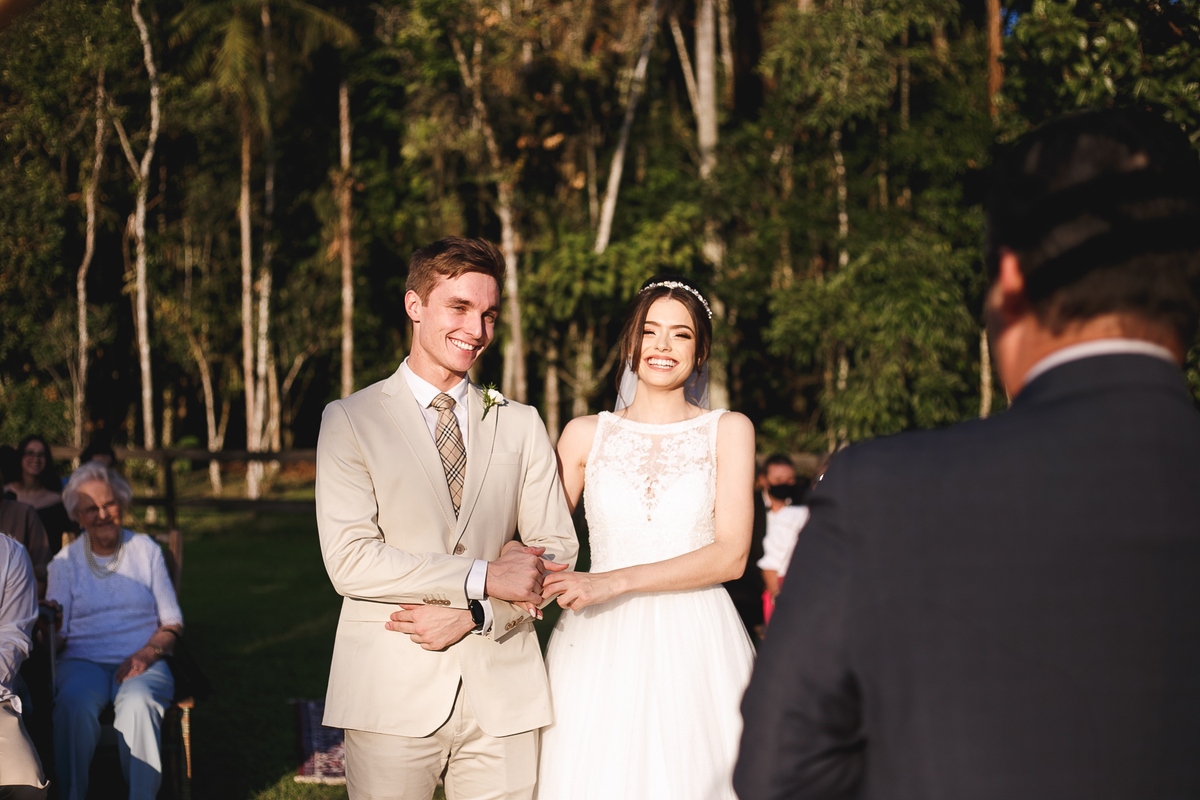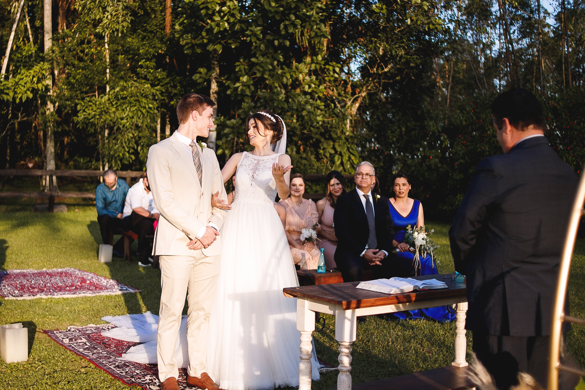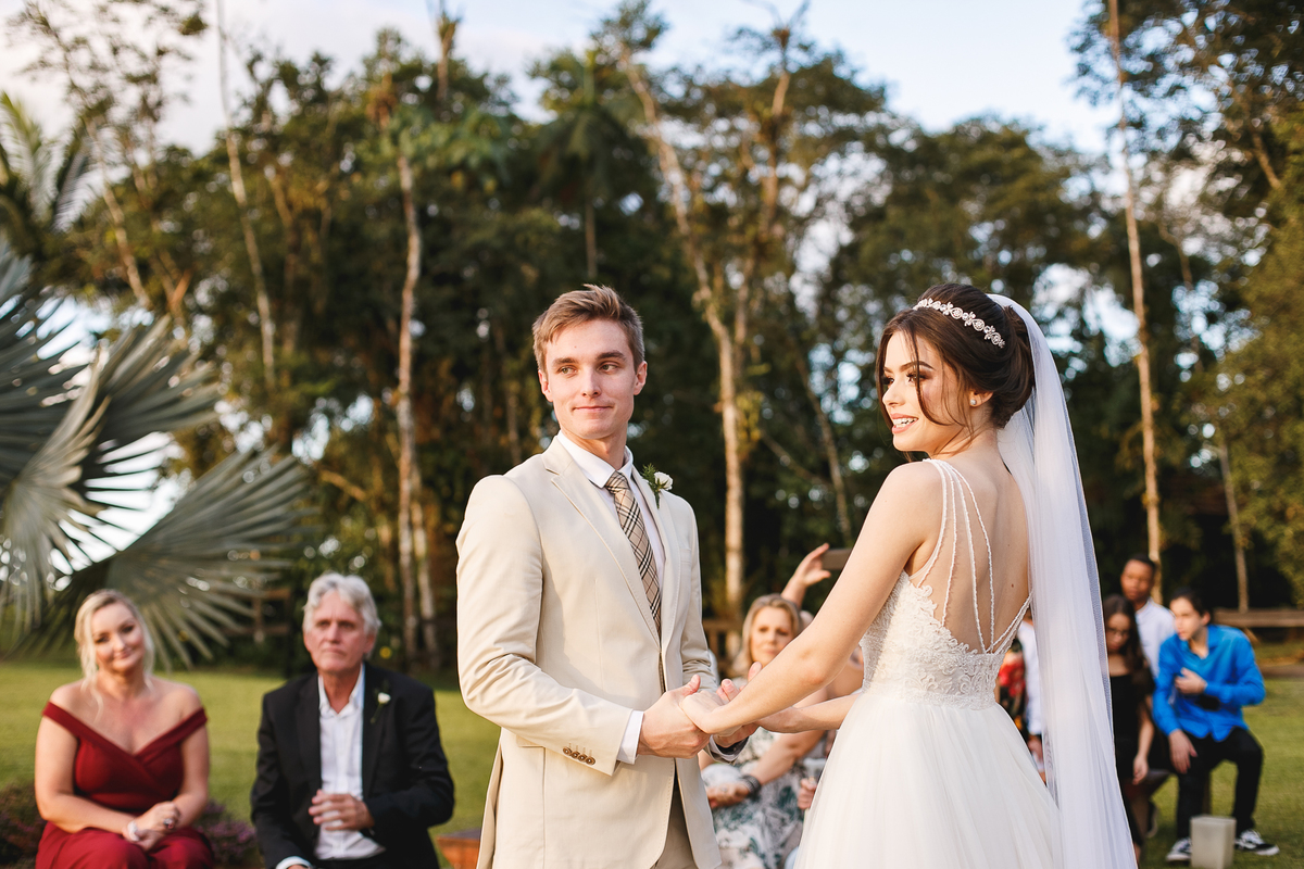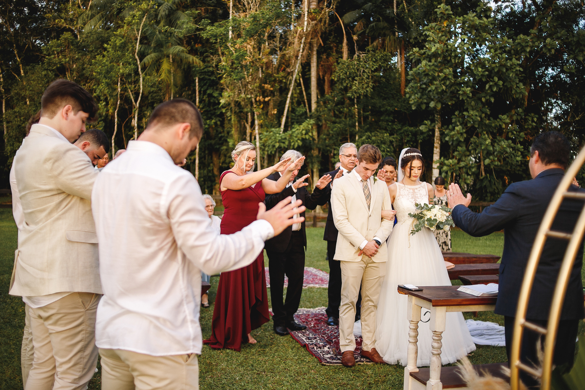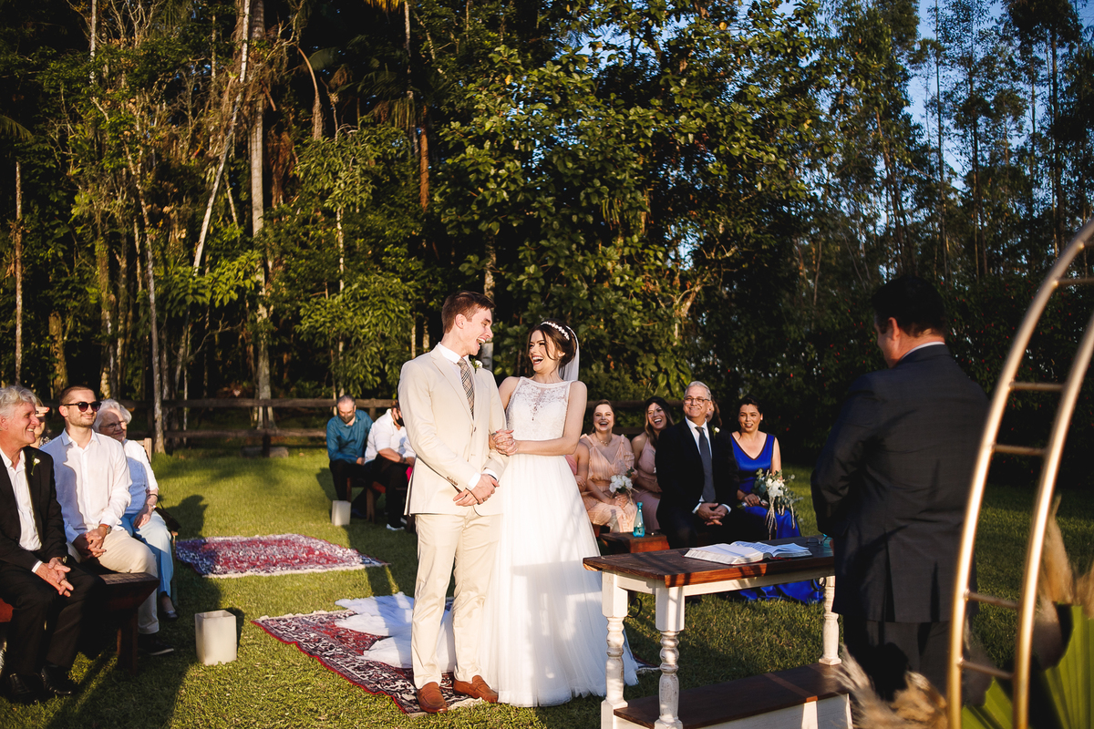 Na semana do casamento, quase nada parecia certo. Ainda existiam dúvidas sobre os últimos detalhes… e até sobre onde seria a cerimônia! A ideia inicial era subir a serra, mas a vida — com seus imprevistos e jeitinhos de nos mostrar novos caminhos — levou tudo para mais perto de Joinville. E, no fim, não poderia ter sido em lugar melhor. Porque quando o amor é o centro, tudo se encaixa.