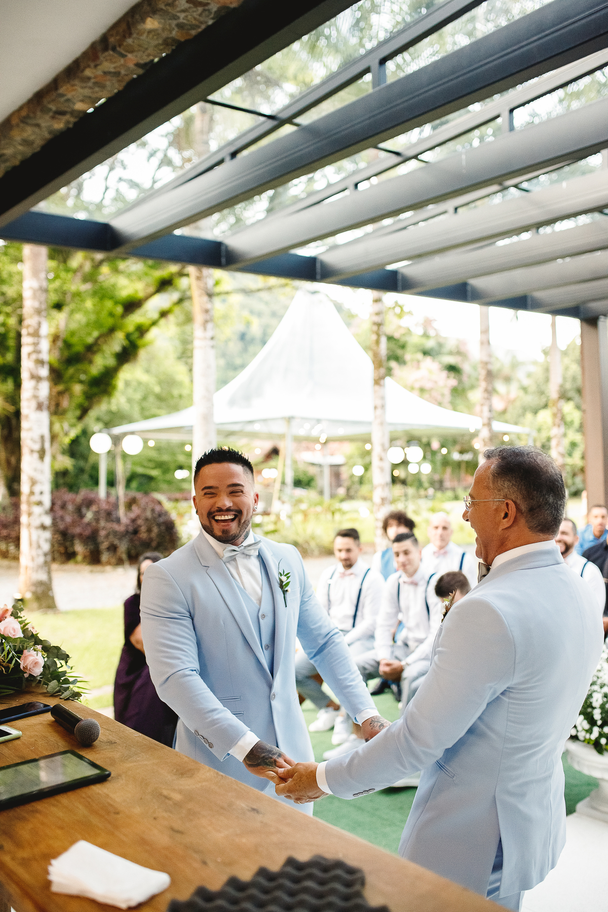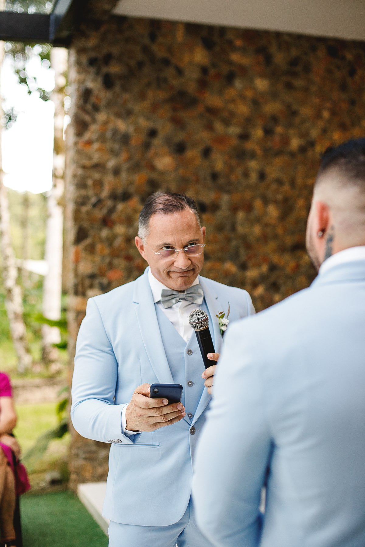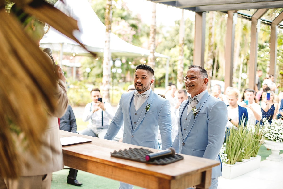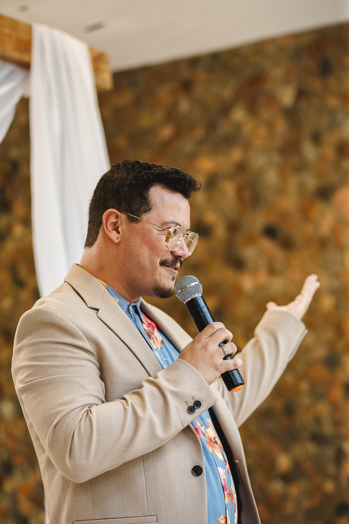 A cerimônia aconteceu no Recanto do Salto 2, cercada de natureza, boas energias e pessoas que vibravam junto. O amigo que celebrou foi quem deu o tom da cerimônia — leve, sincera e cheia de significado.
