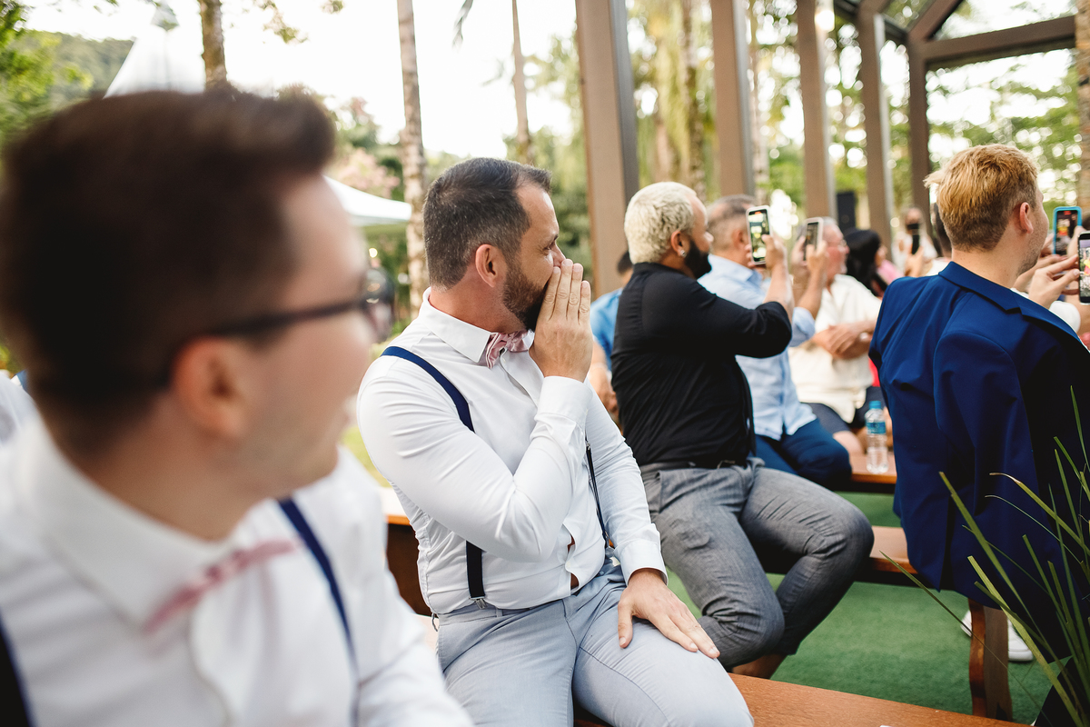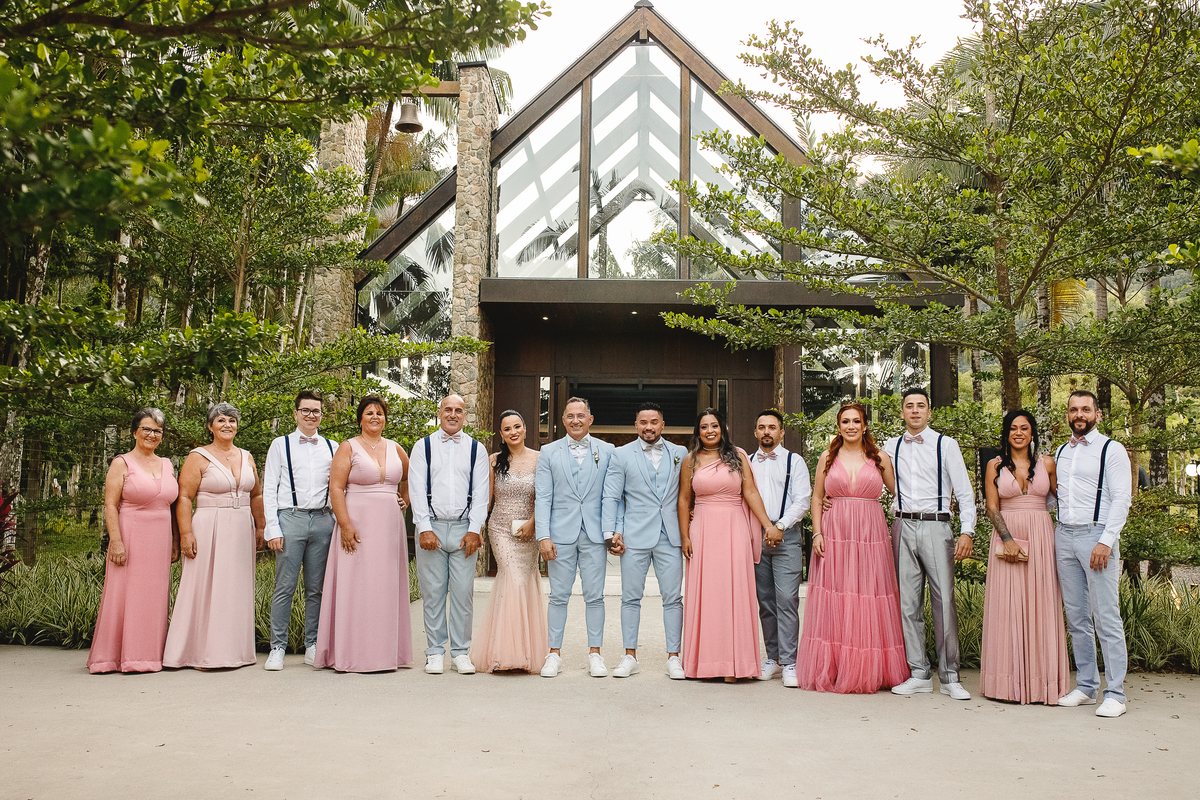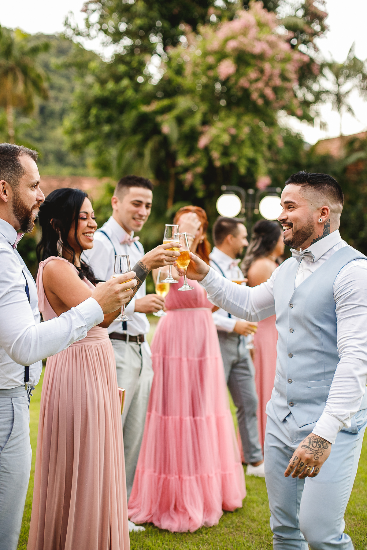 Mas o momento que ninguém esquece foi a entrada das alianças: um amigo, montado de drag pela primeira vez, surgiu em meio à surpresa e às palmas de todos. Um gesto simbólico, colorido e cheio de coragem — exatamente como o amor deveria ser.